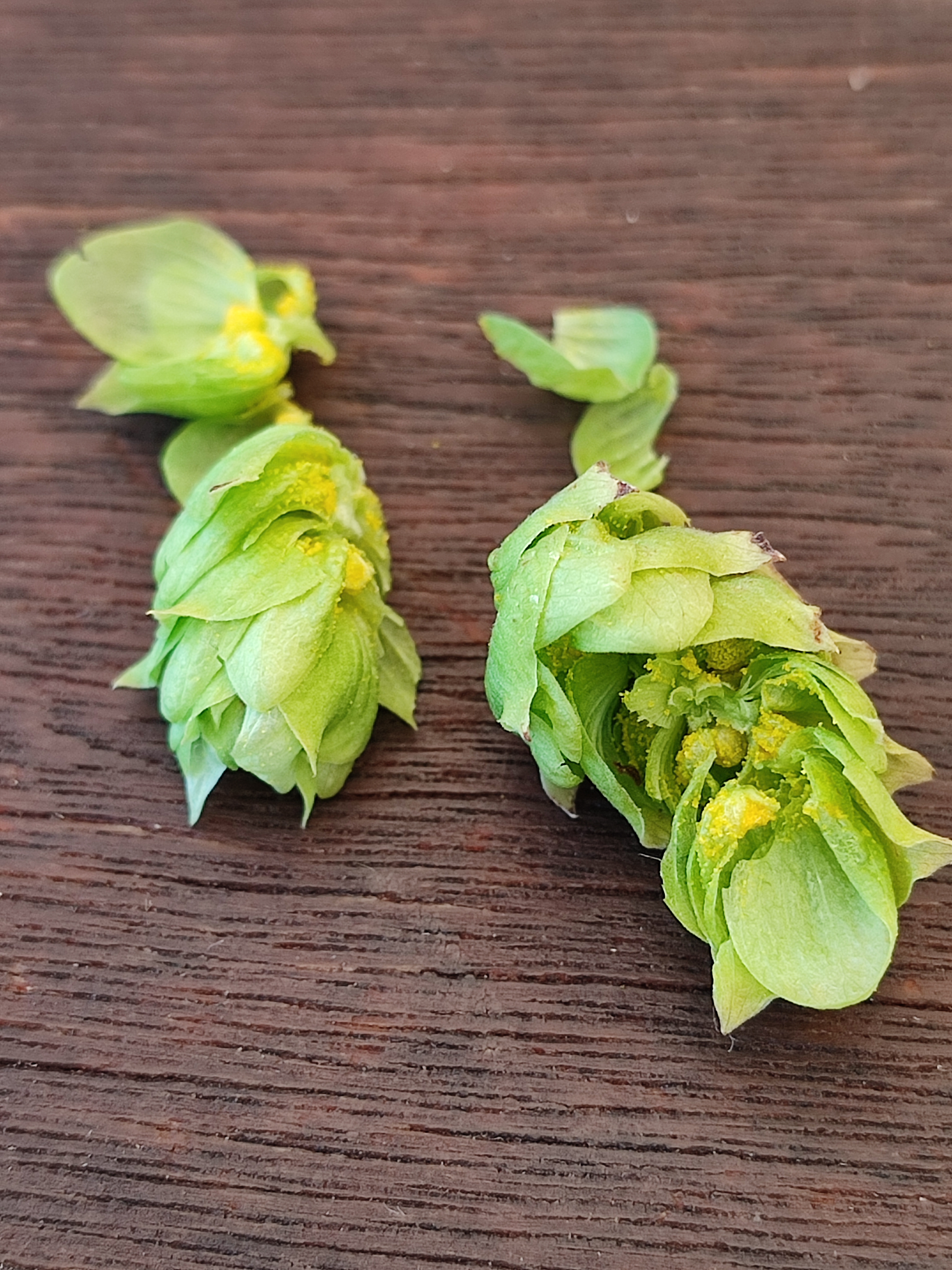 Ich habe eine Dolde geöffnet und es ist ordentlich Lupulin zu sehen. Ebenso hat sie sich leicht zupfen lassen, der Drucktest war auch OK und die Ecken sind auch bräunlich. Anbei noch zwei Bilder. Würde mich über eure Einschätzung freuen. Vorab vielen Dank und nen schönen Abend.