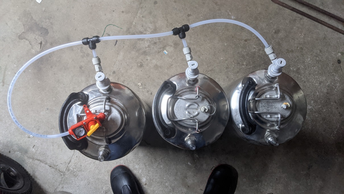 Abfüllung erfolgt per In-Line Daisy Chain. Die Kegs sind mit CO2 gespült. Am letzten Keg ist das Spundventil angeschlossen.