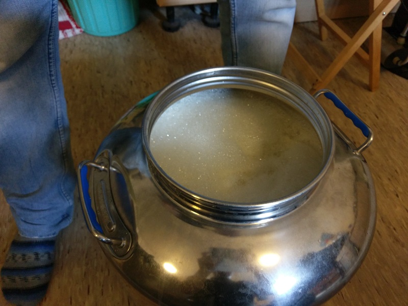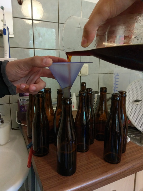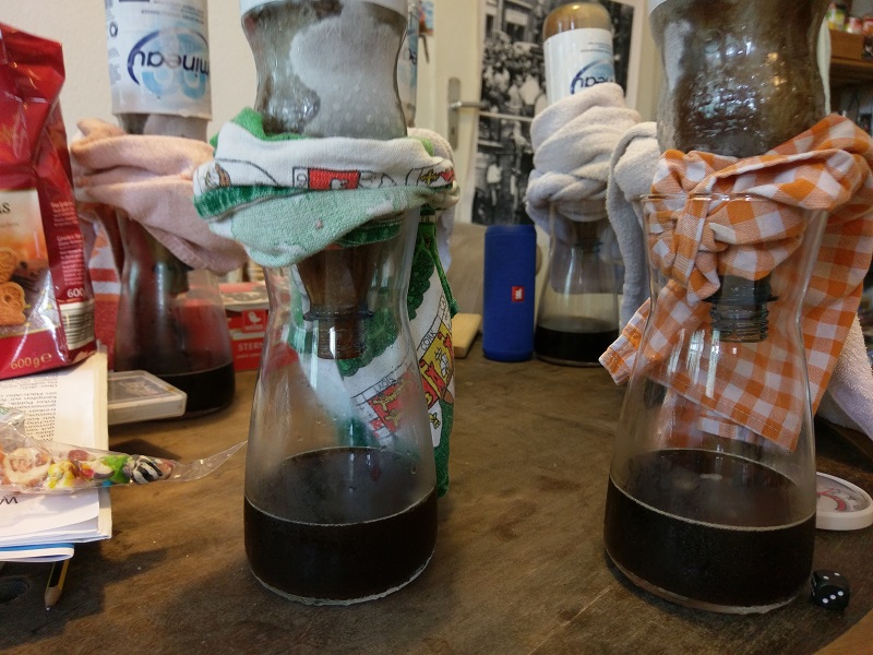 Parallel dazu wurde dann auch gleich der eingefrorene Teil meines "Cookie Dude" Keksbieres ( viewtopic.php?f=17&t=11576&p=233324&hil ... er#p177753 ) in die Auftauphase geschickt und in Flaschen gefüllt. Dabei sind aus 6L dann etwa 2,3L zu ca. 25% vol. alc. eingedickt, also eher in Richtung Likör/Schnaps. Aber seht selbst: