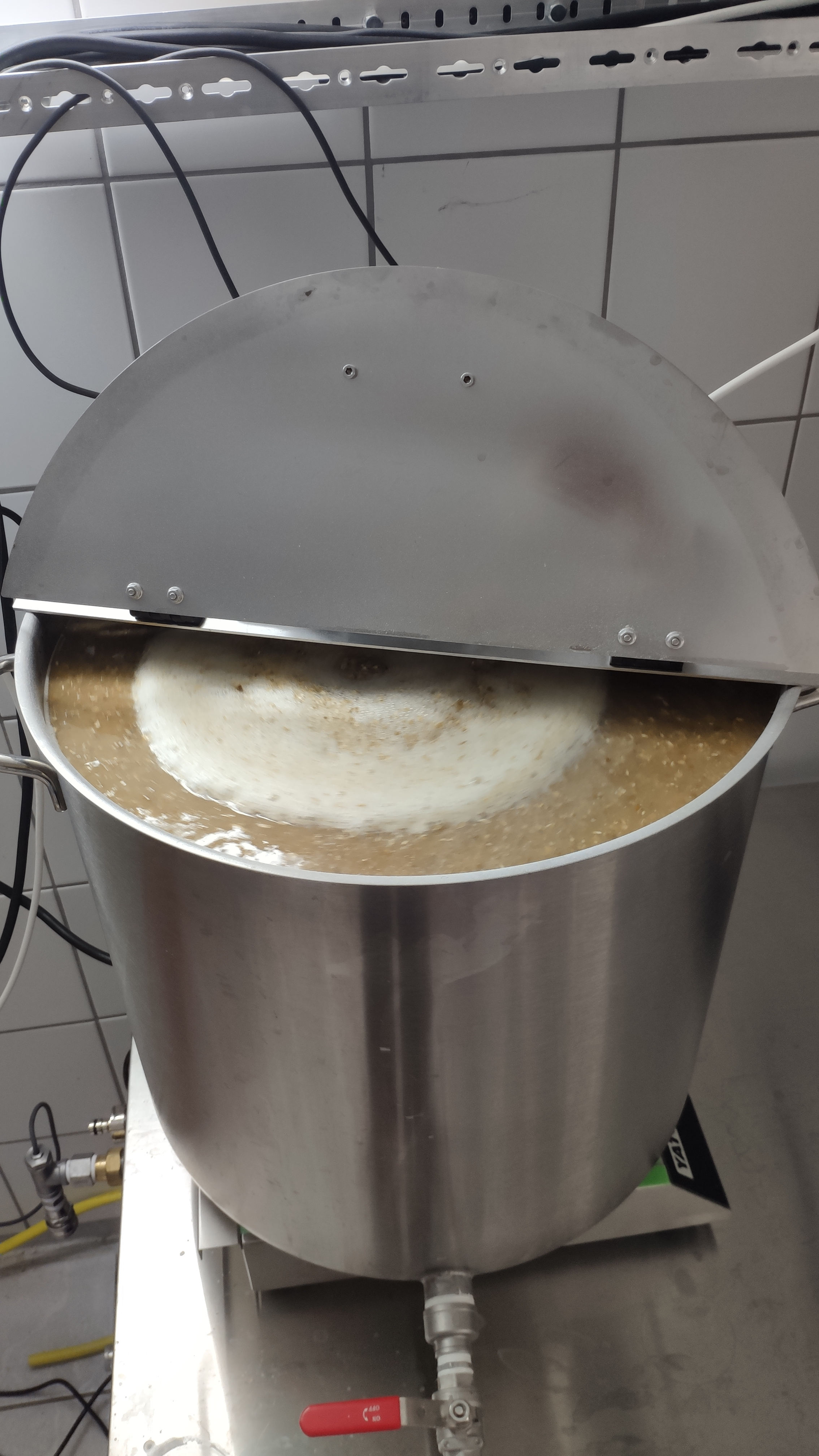 Interessant ist dabei, dass die Yato ca. 100 Watt mehr Leistung aufnimmt, wenn der Topf auf den Streifen steht. Yato und Heißwasserbereiter werden vom Craftbeerpi gesteuert, zusätzlich wird noch die Temperatur am Ausgang des PWT angezeigt. Der Maischetopf ist mit Rührwerk und Läuterhexe ausgestattet. Nachguss macht ein Klarstein Konfistar 50 - durch die Schichtung der Temperaturzonen kann man den (im Boden) eingebauten Thermostaten zwar vergessen, aber für den Nachguß reicht es mit dem selbst eingebautem Sensor. Nach dem Einmaischen rotiert die erste Teilmaische und wird anschließend gekocht. Die Earl'sche Tabelle zur Berechnung der Teilmaischen hat bestens funktioniert - mit dem zweitem Teil Hauptguss und Schrot wurde die Zieltemperatur optimal erreicht. Rechtzeitig den Nachguss auf 85° heizen, den lasse ich dann noch durch Pumpe und PWT zirkulieren (wegen den bösen Bakterien :) Bis zum Abmaischen ist der Nachguss dann auf ca. 75°. Mit 63 Litern ist der Maischetopf ordentlich voll, aber Yato und Rührwerk halten das problemlos aus. Läutern - ich weiß, nicht optimal, aber auch im zwanzigsten Jahr hat mich die Läuterkatastrophe nicht erreicht.