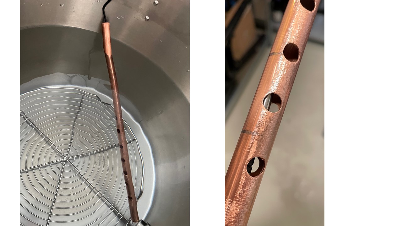 Zum Einsatz kam erstmals meine Messlanze aus einem Stück Kupferrohr und dem Sensor vom InkBird. Wirklich ärgerlich ist nämlich aus meiner Sicht, dass das Kabel so stark bei Anlieferung in der Verpackung geknickt ist und sich daher ehr störrisch im Kessel verhält. Nun ist es im Kupferrohr eingesperrt und eumelt nicht mehr wild durch die Gegend.