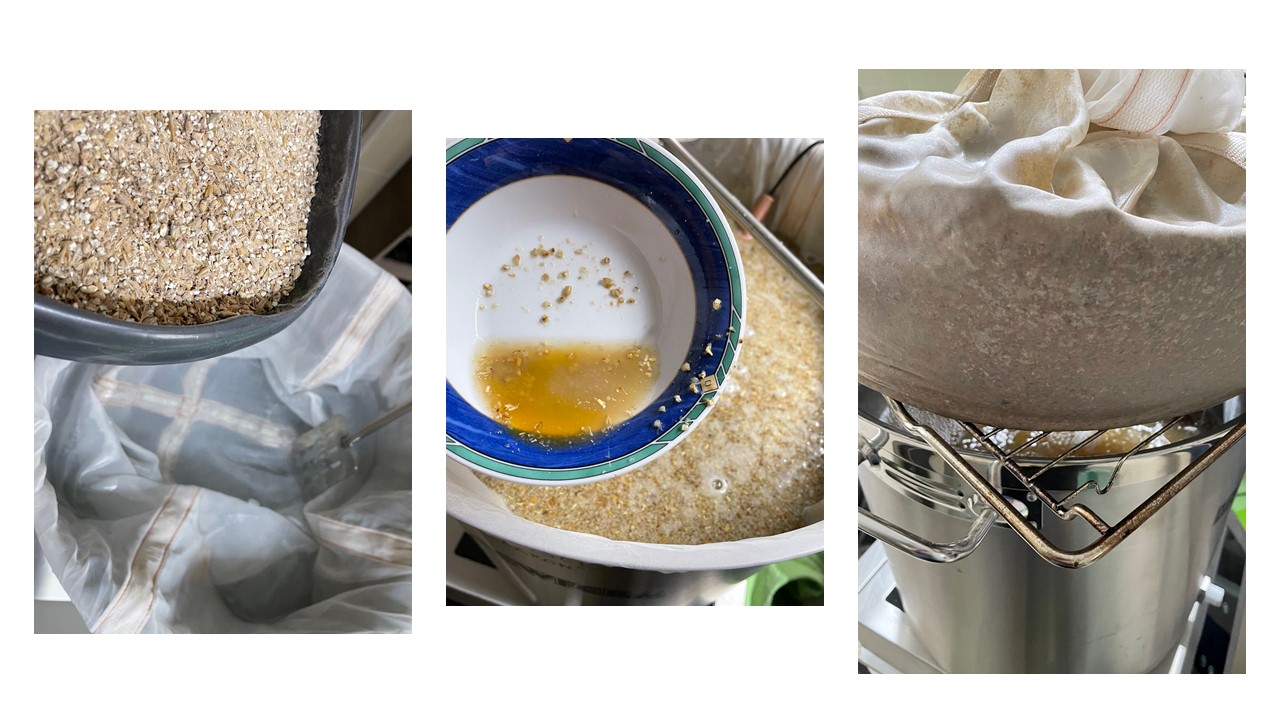 3. Heizen auf 78°C und dann Läutern, d.h. den Sack hochstemmen und abtropfen lassen. Der Backofenrost passt perfekt auf den Kessel und hält den Beutel sicher.