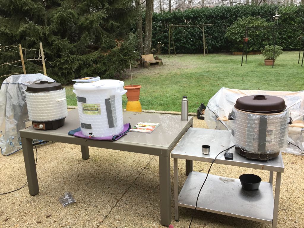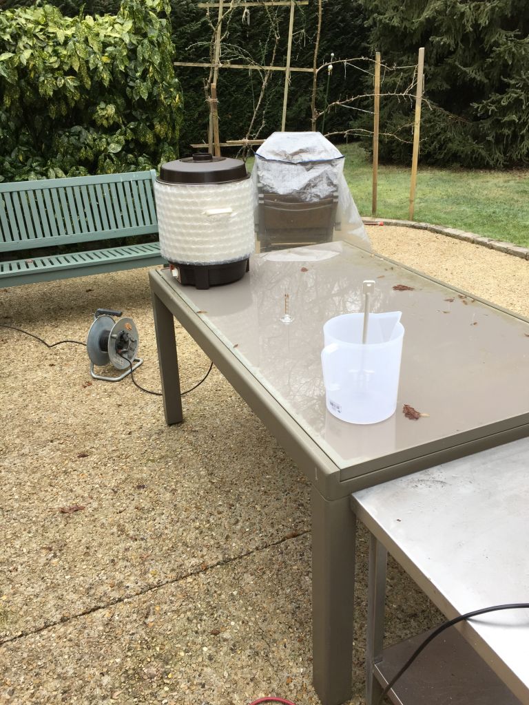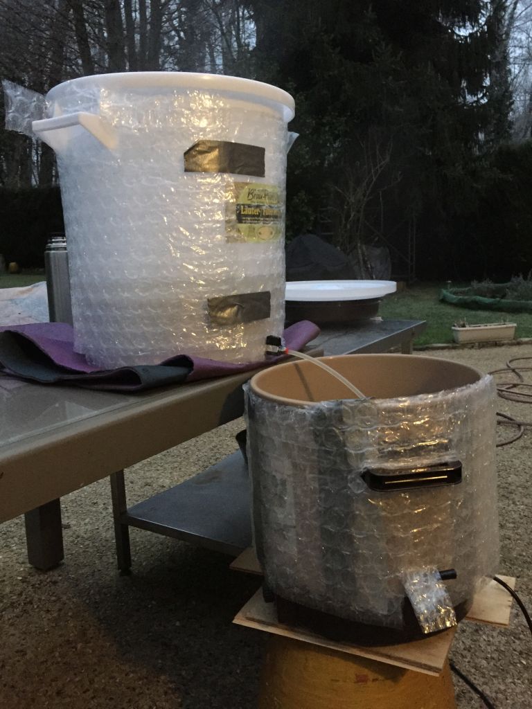 Läuterbottich. Der Fön auf dem Bild war übrigens dafür da den Wasserhahn an der Hauswand aufzutauen. Sonst hätte ich das Wasser rausschleppen müssen...