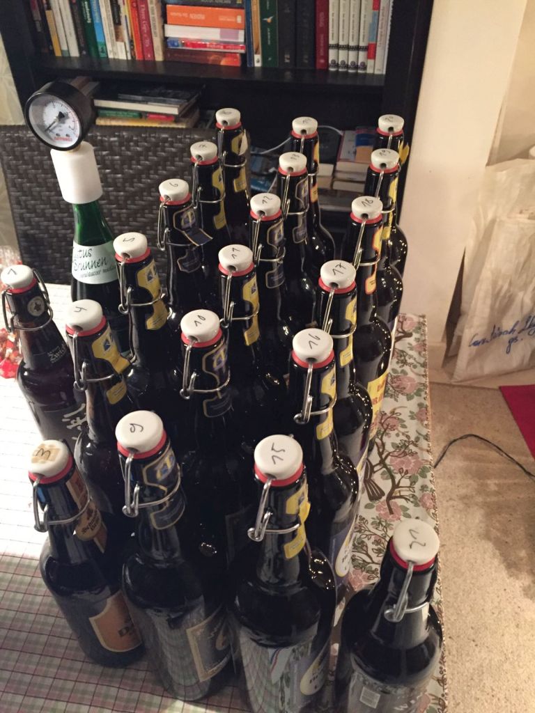 Frage am Rande: Sind das die Etiketten der Originalbiere auf den Flaschen? Warum entfernst du die nicht beim Reinigen? Ich lass die immer 10min in warmem Wasser einweichen, dann fallen die fast von selbst runter ;)