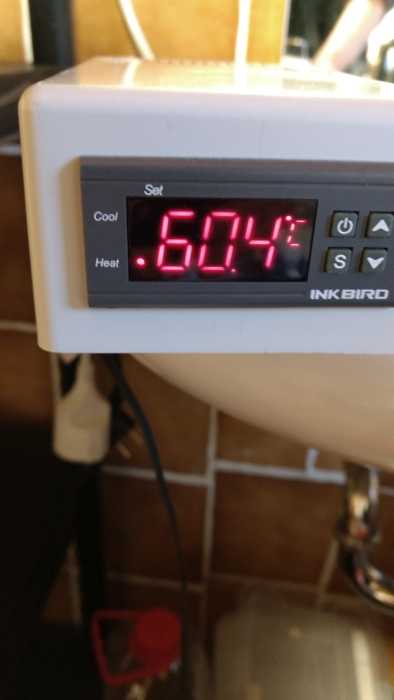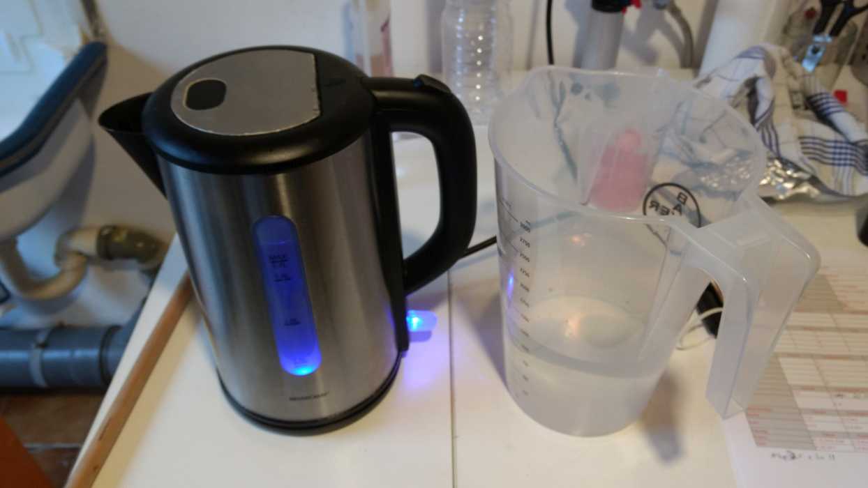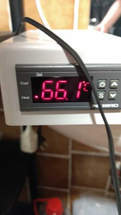 HG waren 15l @ 75°C. Da da Malz mit 12°C zu kalt war, sank die Temperatur auf 64°C, so dass ich 2,5l kochendes Wasser nachgegeben habe => 66°C.