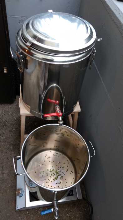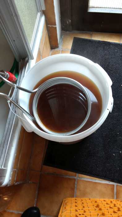 Läutern (17l NG) und Kochen lief gut. Ergebnis: 30l @ 100°C mit 14,4 brix => SHA=67%.