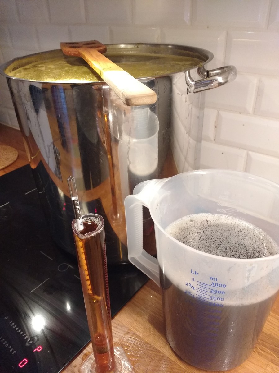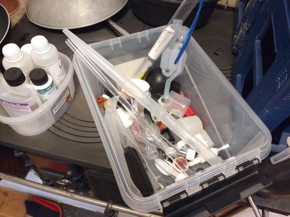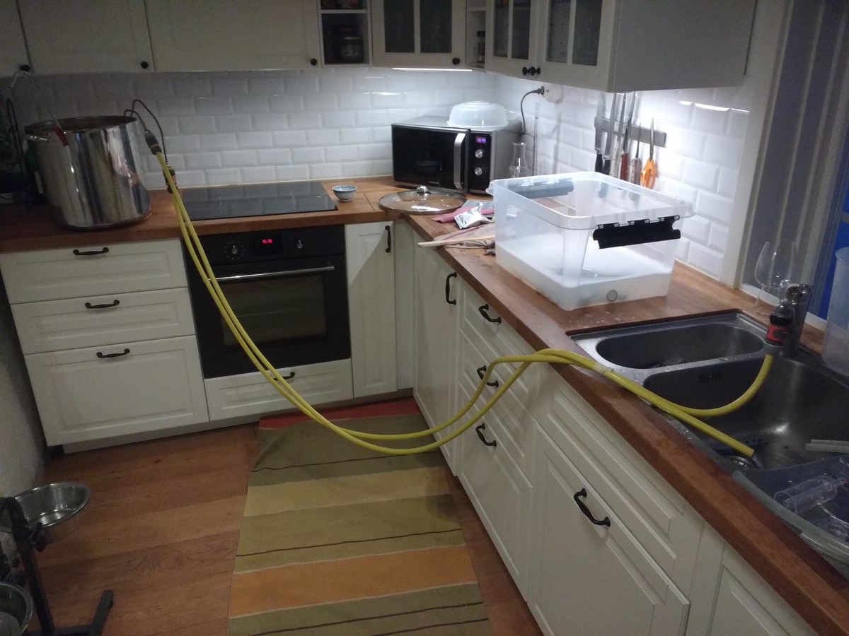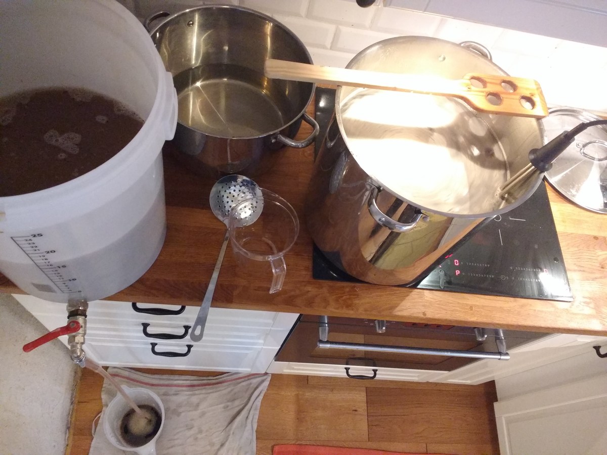 Nach dem Abkühlen und Hopfenseien schnell aufteilen, verdünnen und die beiden Hefen anstellen, W34/70 aus ein paar Tage altem Pils-Bodensatz, und WLP833 aus Starter. Jetzt ist die Küche geputzt und ich bin ordentlich geschlaucht.