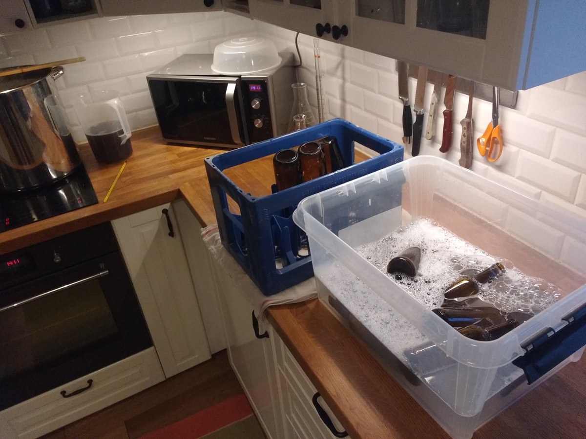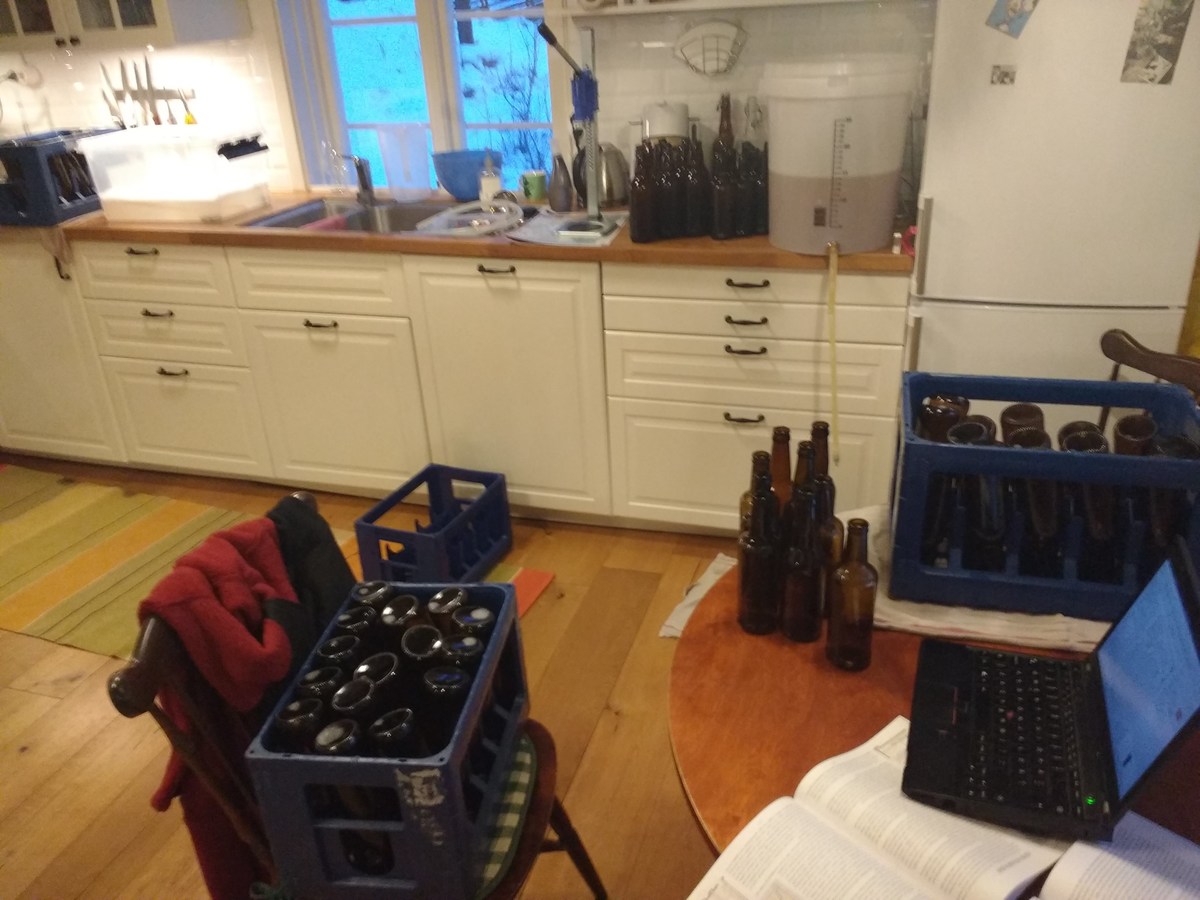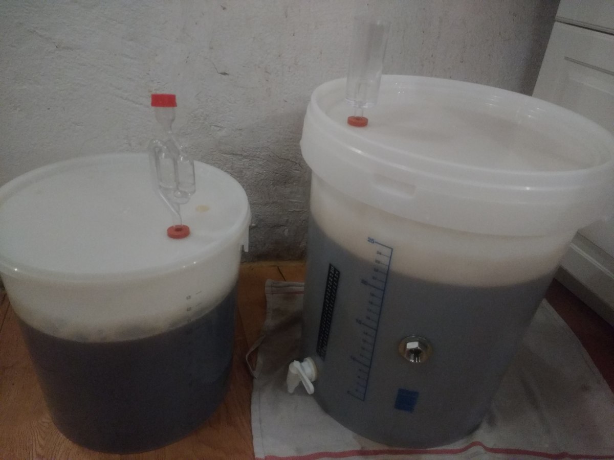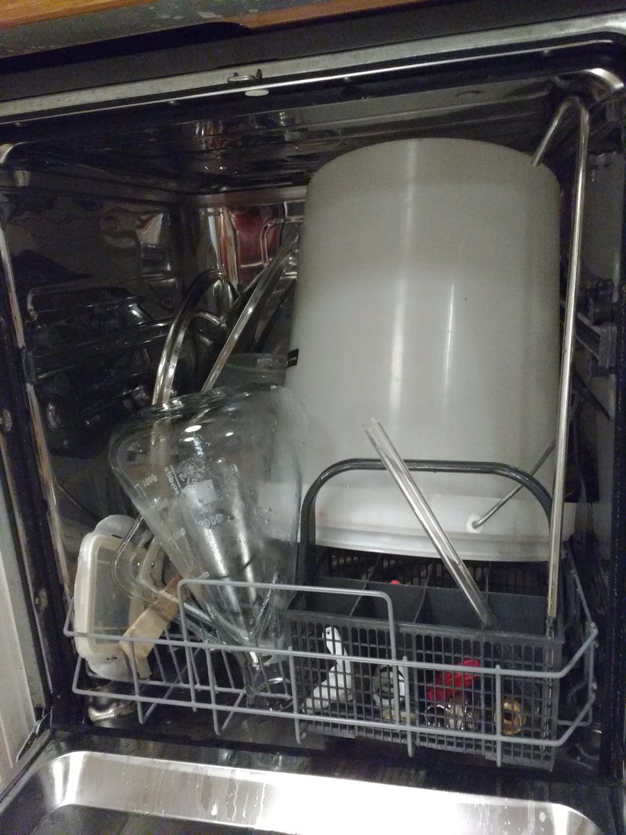 Nach dem Abkühlen und Hopfenseien schnell aufteilen, verdünnen und die beiden Hefen anstellen, W34/70 aus ein paar Tage altem Pils-Bodensatz, und WLP833 aus Starter. Jetzt ist die Küche geputzt und ich bin ordentlich geschlaucht.