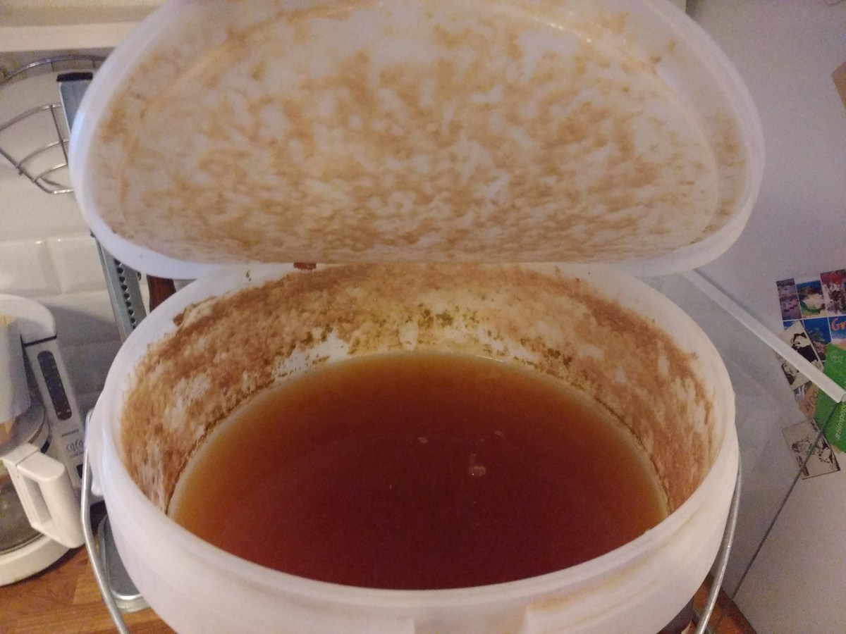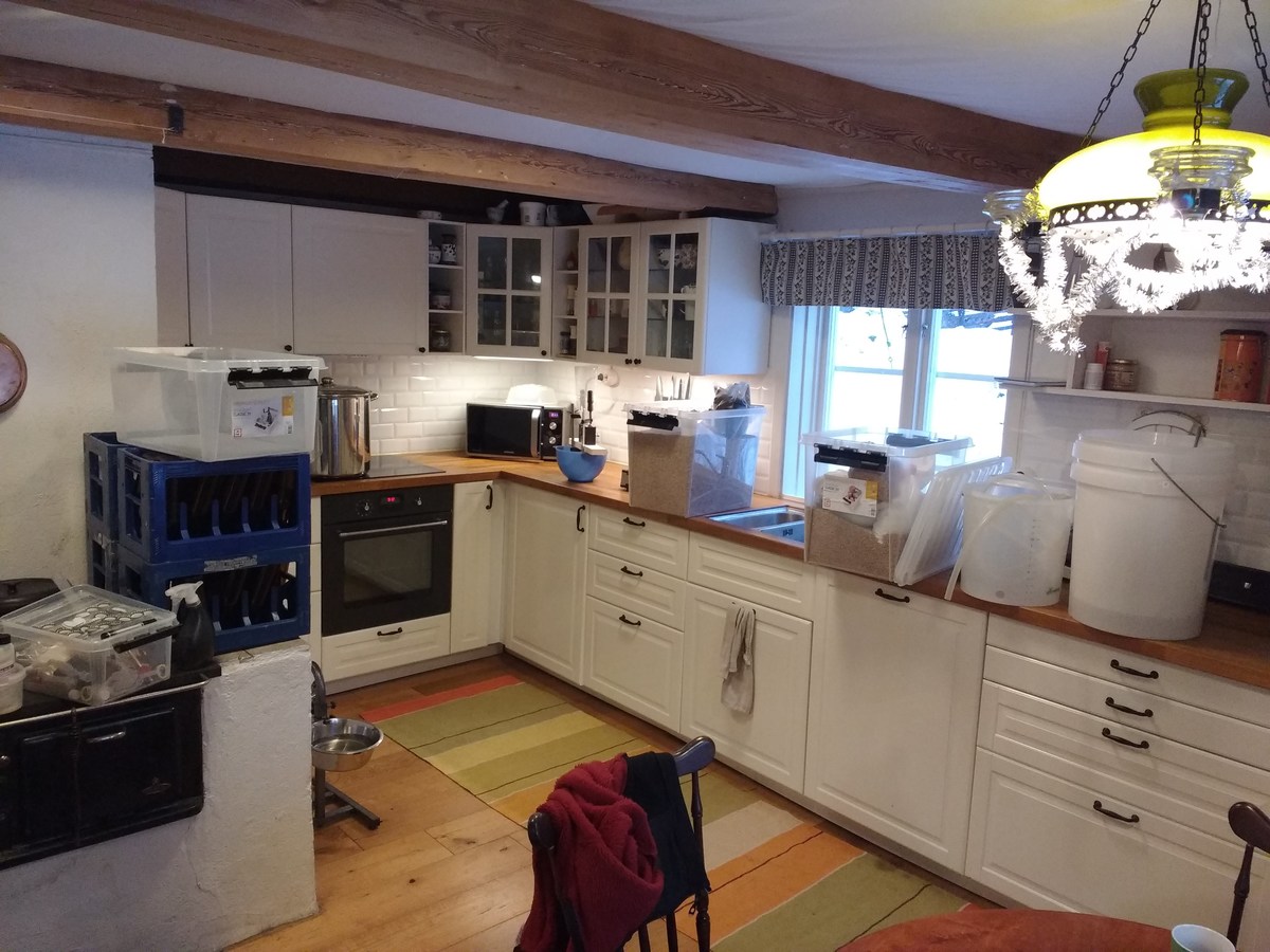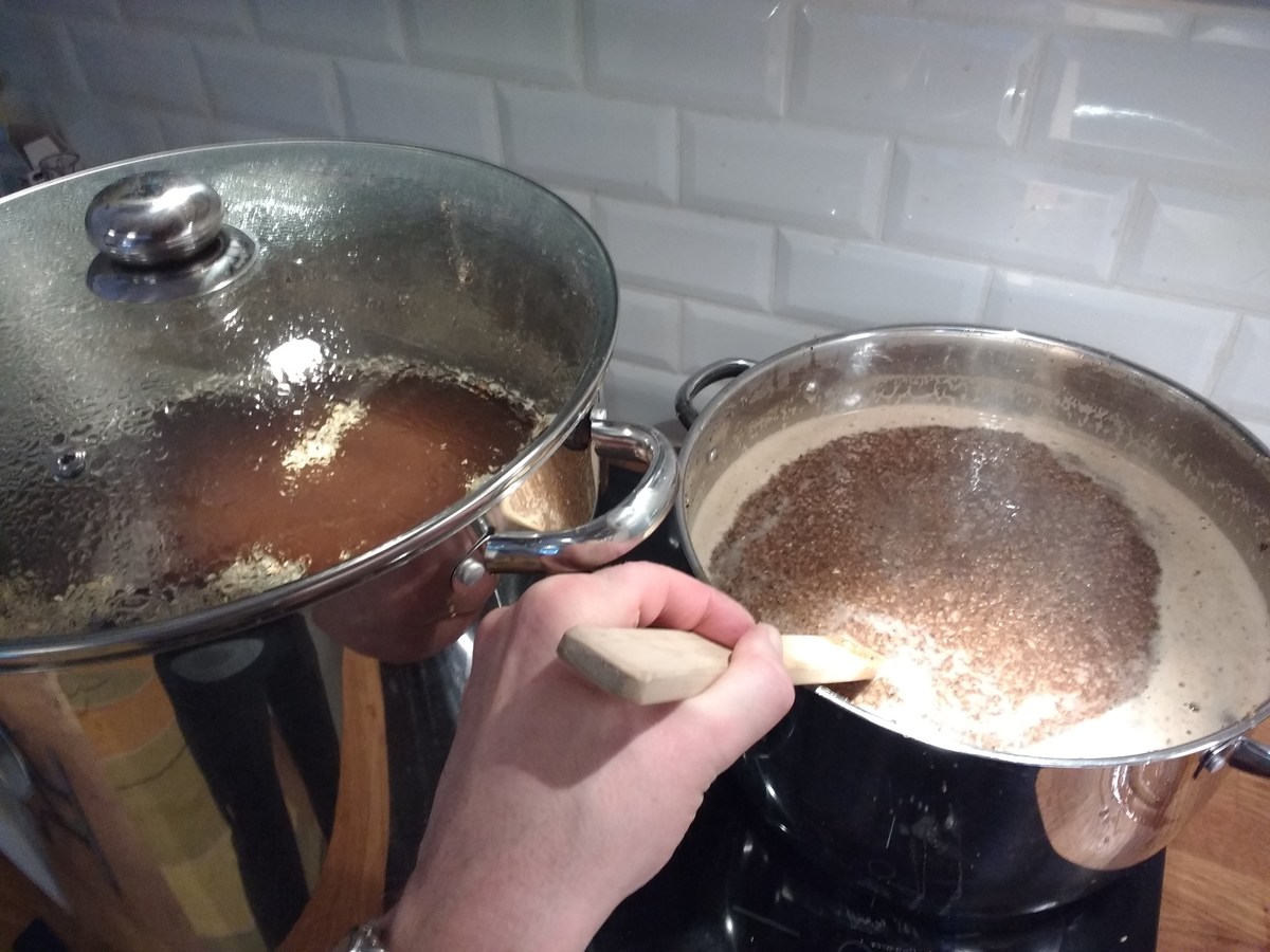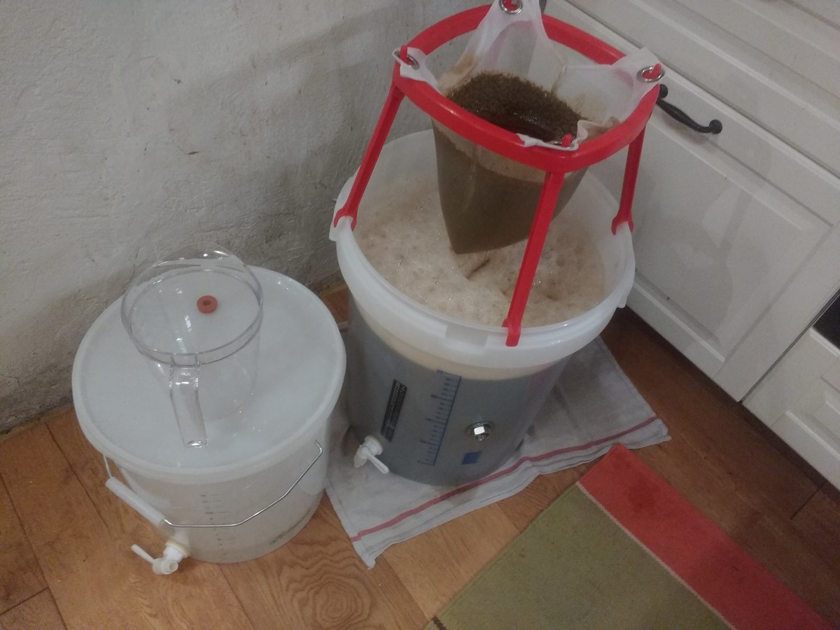 Nach dem Abkühlen und Hopfenseien schnell aufteilen, verdünnen und die beiden Hefen anstellen, W34/70 aus ein paar Tage altem Pils-Bodensatz, und WLP833 aus Starter. Jetzt ist die Küche geputzt und ich bin ordentlich geschlaucht.