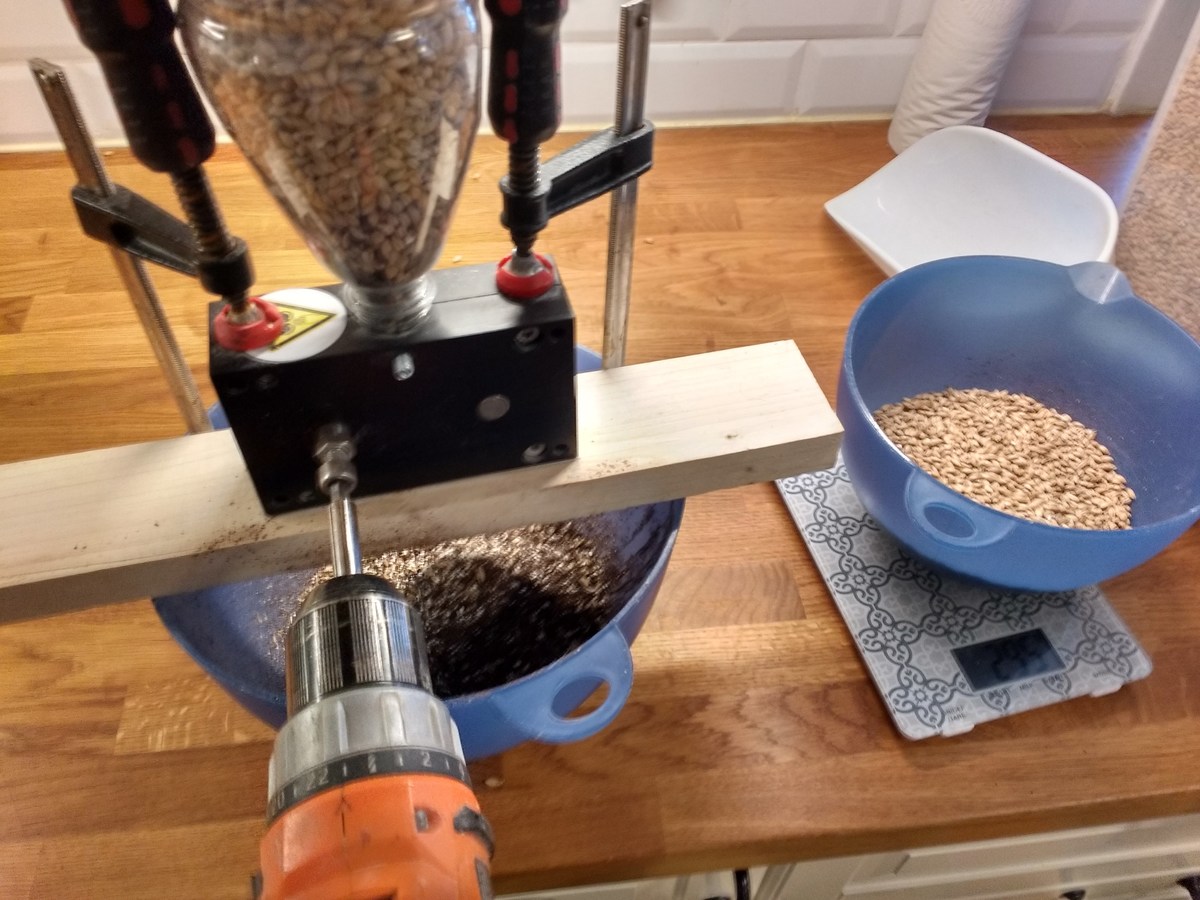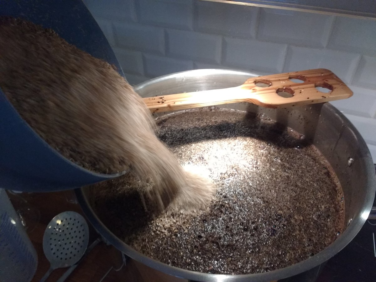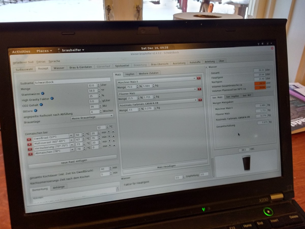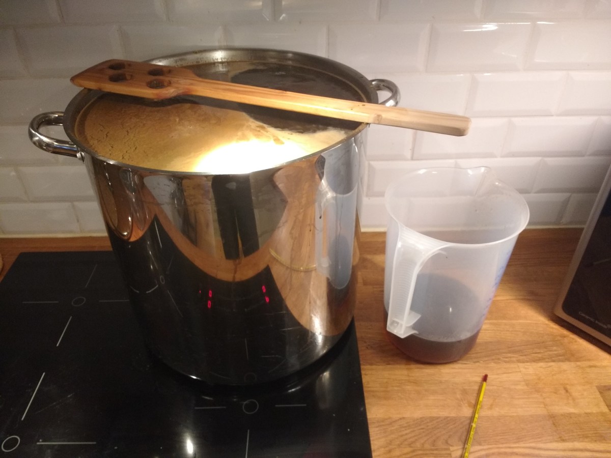 Heute habe ich mal ein paar mehr Bilder gemacht als sonst. Der Sud war meine erste Dekoktionsmaische (zwei Stufen), für ein Schwarzbier mit 16°P. Auf die 34L Ausschlag komme ich nur mit "high-gravity", der Topf hat 30L und war sowohl beim maischen als auch kochen randvoll. Bei knapp 8kg Malz war ich mir nicht sicher, ob ich die im Eimer geläutert bekomme, aber ging gut (69% SHA). Der zweite Topf war für die Teilmaischen, dann für Nachguss. Parallel hab ich ein IPA abgefüllt, musste aber warten bis nach dem Läutern, wegen des Eimers.