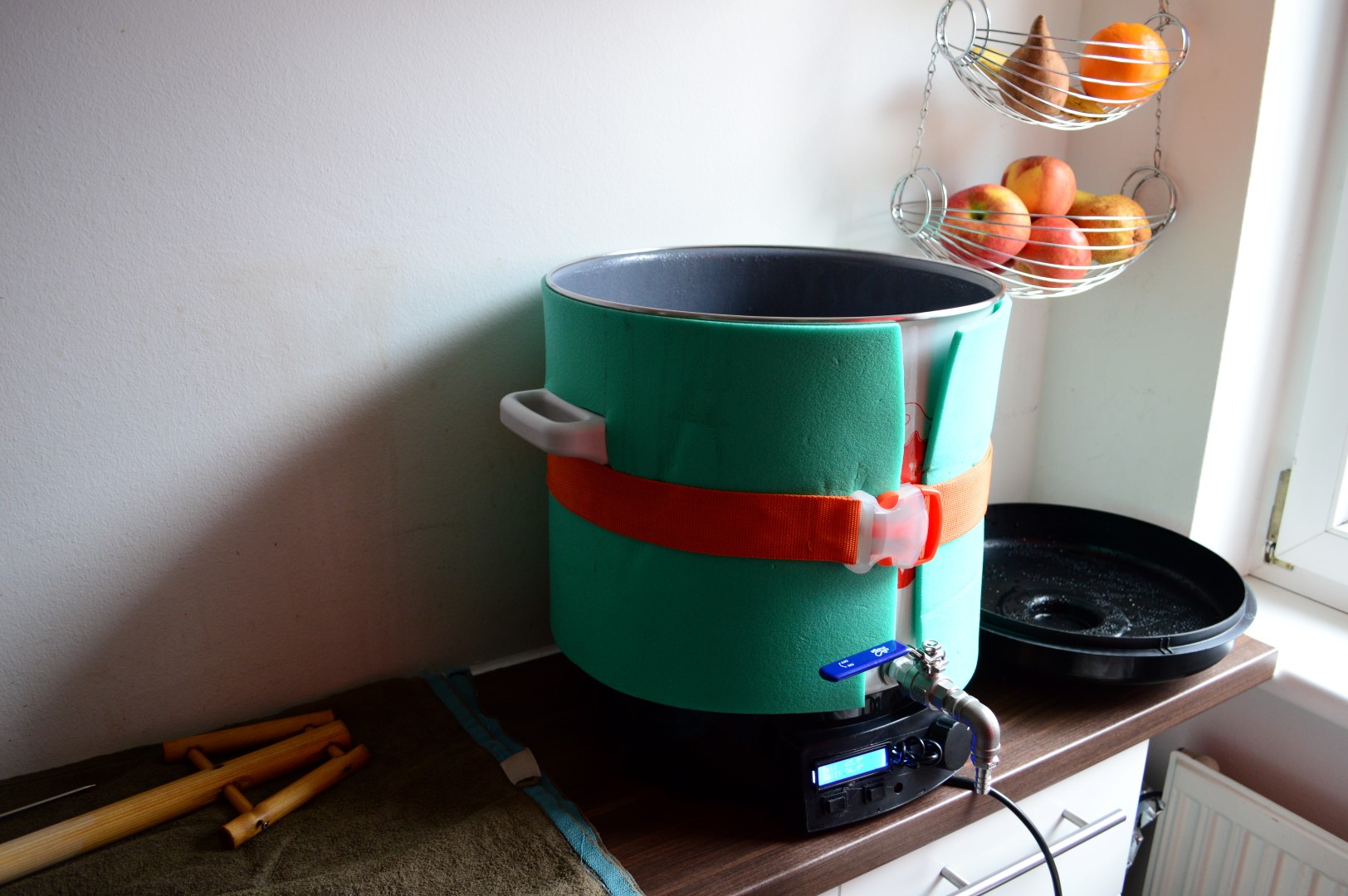 So sieht meine Läutervorrichtung aus. Das modische Handtuch ersparte leider nicht das gründliche Bodenwischen am Ende...