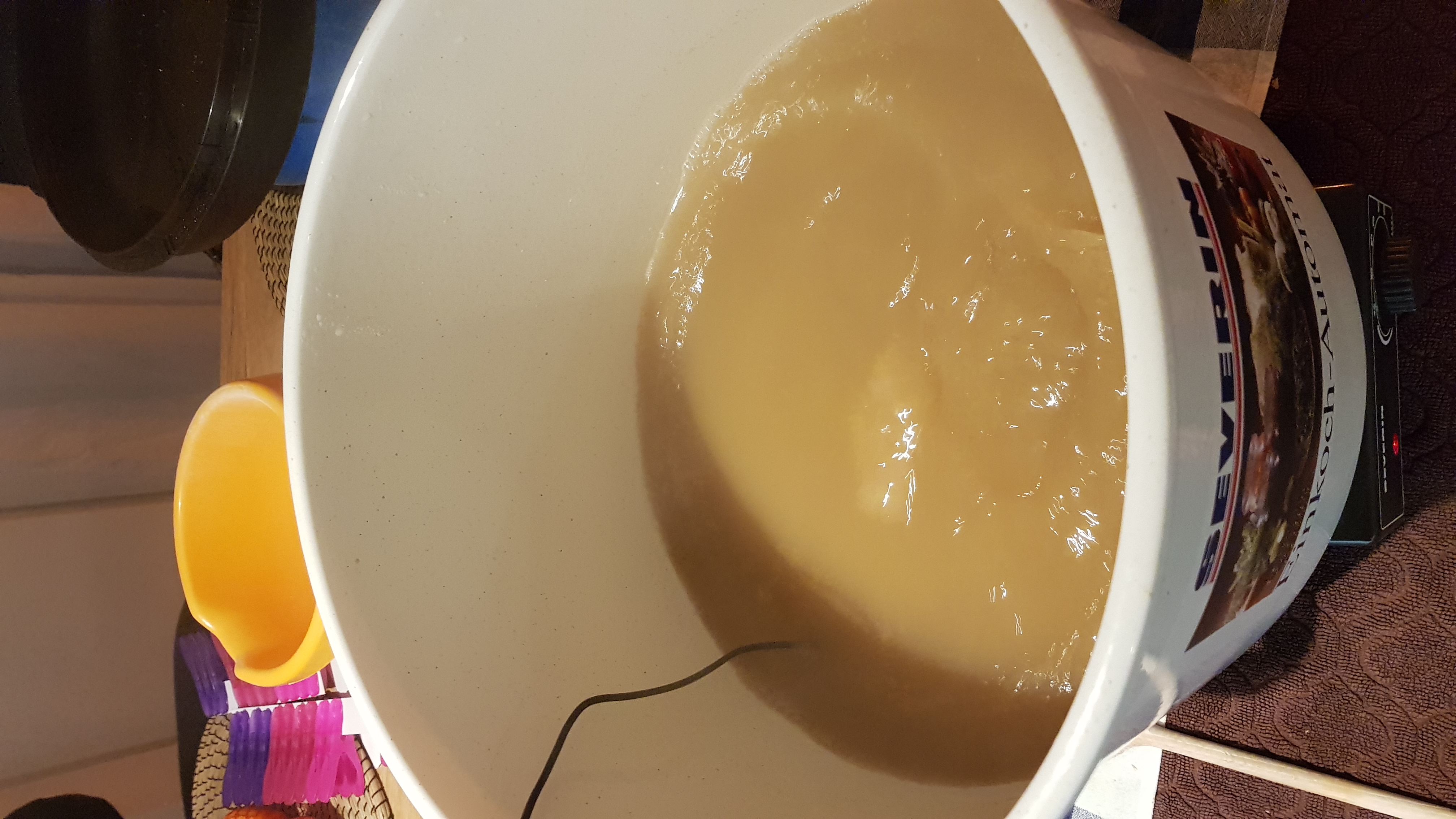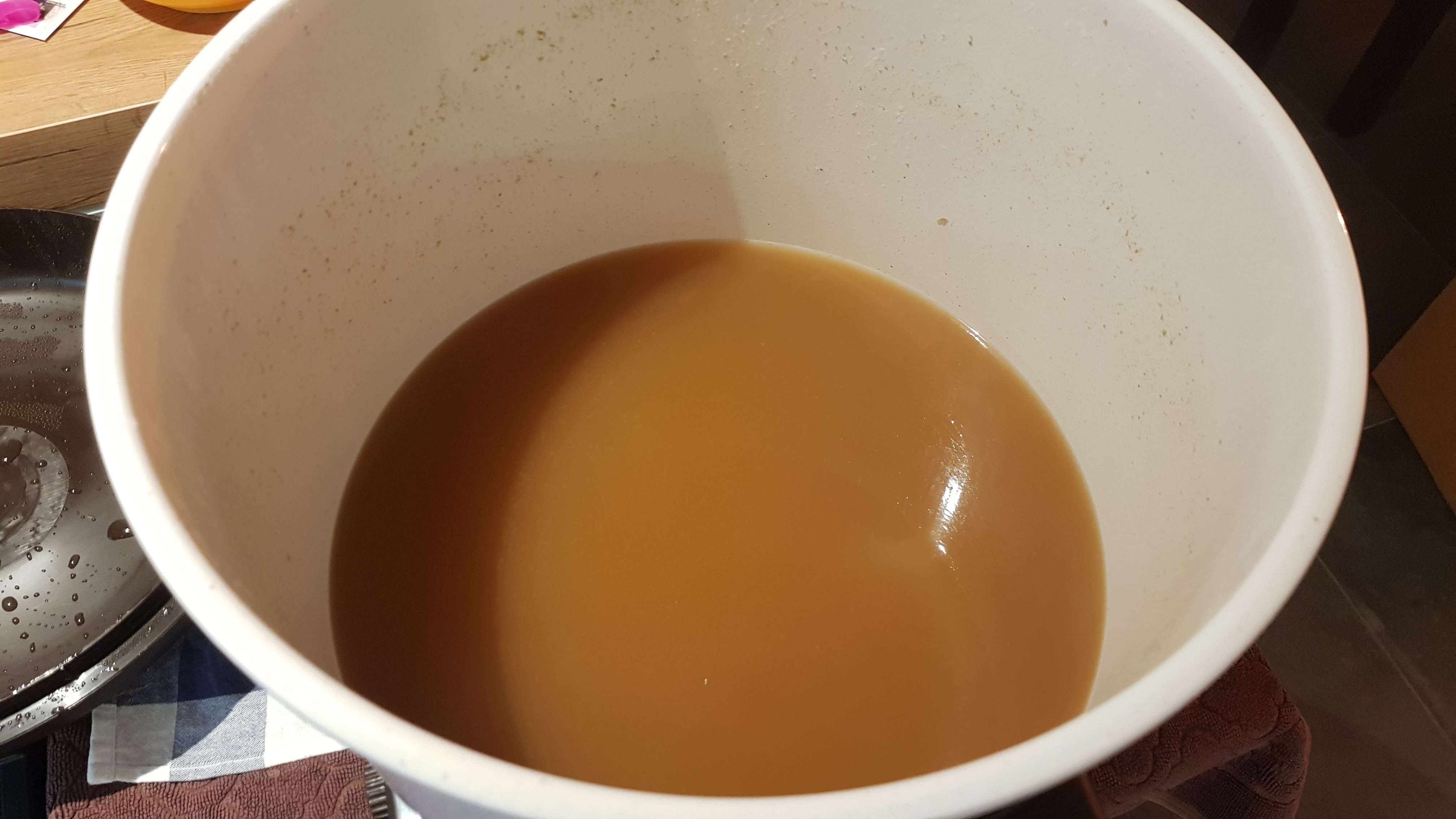 Ich hatte eine Stammwürze von 15. Darauf hin habe ich einfach nach Bauchgefühl 1,5l Wasser abgekocht und damit verdünnt. Es ergab sich eine Stammwürze von 11. Da ich keine Liter-Skala am Eimer habe weiß ich nicht wie viel Ausbeute ich habe. Der Eimer fasst 17 Liter, also habe ich sehr viel verloren. Jetzt kommt die Hefe rein und dann warten wir mal ab ob es was wird.
