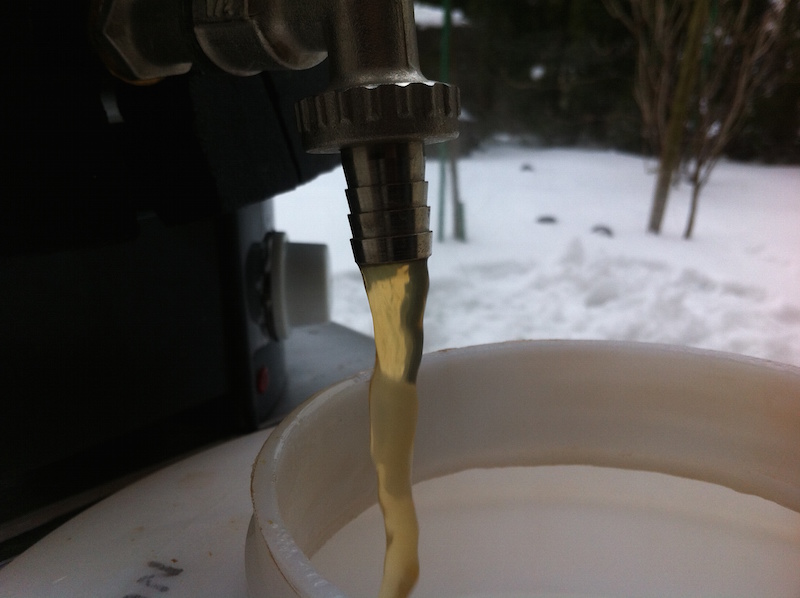 So sieht es aus, wenn das ganze durchgelaufen ist: Hopfenkochen des Dampfes wegen im Freien. Der Deckel kommt runter, sobald es kocht. Wer genau hinschaut, erkennt schon Hefenahrung und Irish Moss. Der Einkocher ist mit Armaflex isoliert, welches dank Klettverschluss zum Reinigen einfach abgenommen wird. Der Treber ist auf dem Kompost, die Würze kocht gleich. Nach Kochende einfach direkt ins Gärfass. Hopfeneseihen lass ich auch bleiben. Trübe Vorderwürze ohne Hopfenfiltern, und trotzdem läuft es klar ins Gärfass: Der heimliche Star im Hintergrund: Würze wurde für den Hefestarter abgezwackt und im Schnee gekühlt. So kann sich die Hefe auf dem Magnetrührer schonmal fitmachen während der Rest des Sudes über Nacht abkühlt. Der genaue Hefestamm ist mir nicht bekannt, es handelt sich um untergärige Hefe die aus dem Bodensatz einer Flasche Schäfleshimmel gezogen wurde. Nach dem Anstellen am nächsten Tag wurde selbstverständlich eine Schnellgärprobe genommen, die schon fleißig am Werk ist: Jetzt kommt der schwierigste Teil, das abwarten. Geplant ist, das Jungbier nach 2 Wochen von der Hefe abzuziehen, und nochmal einen Monat lang im kalten Keller zur Klärung lagern zu lassen, dann erst wird abgefüllt. Das erfordert zwar etwas Geduld, der Lohn dafür ist aber ein minimaler Bodensatz in den Flaschen.