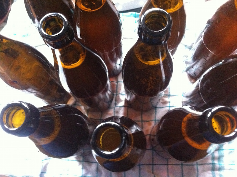 Das Jungbier wurde ja nach der HG (~14 Tage) umgeschlaucht in ein zweites Gärfass, in dem es einen Monat lang im kalten Keller stand. Auch wenn vorher schon die Hefe sich gut abgesetzt hatte, beim Abfüllen fand sich am Boden des Behälters doch noch ein guter Satz. Besser hier als in der Flasche.