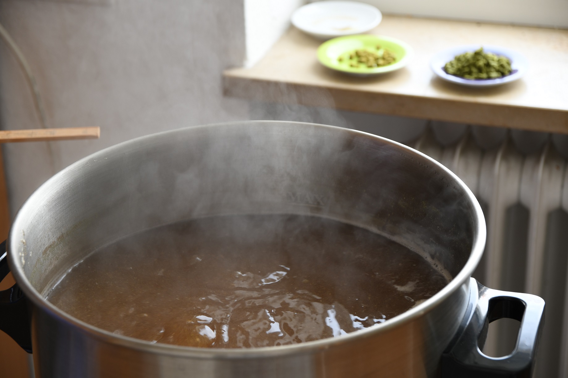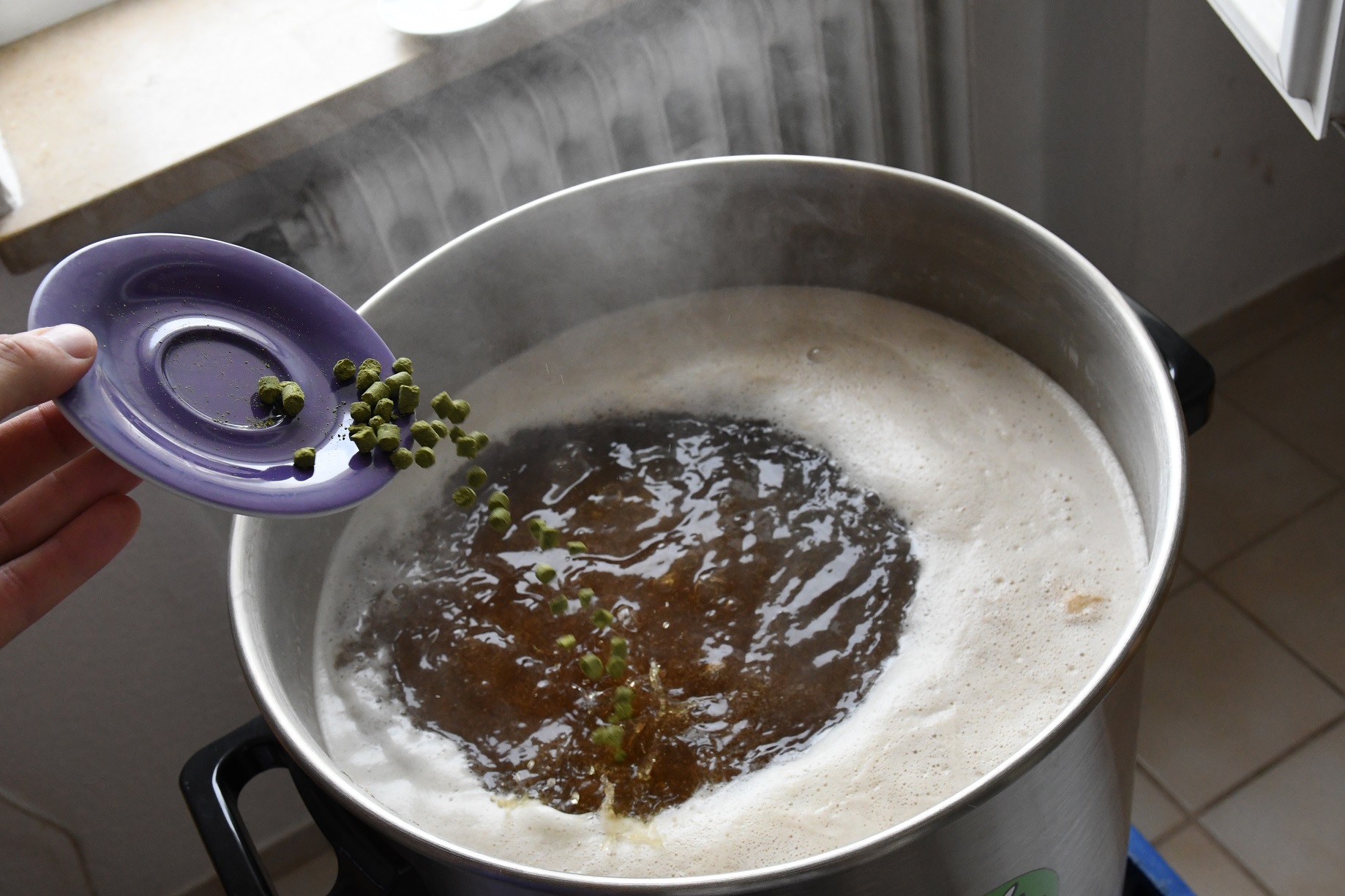 Hopfenkochen... da hab ich glatt vergessen von der Aromahopfengabe ein Foto zu machen... vergebt mir, müsst ihr wohl glauben, dass das passiert ist! Im Hintergrund seht ihr ihn liegen