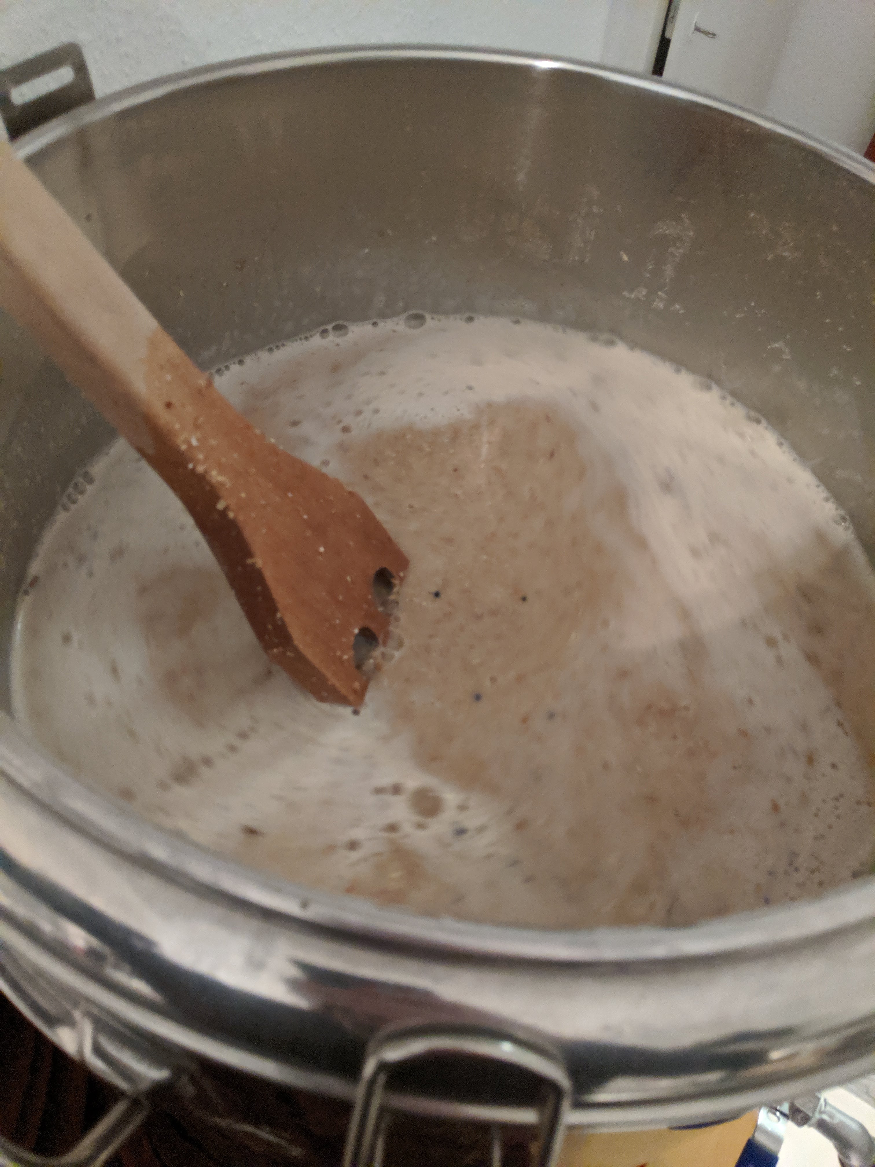 Kurz vor der Arbeit ging's in den Keller und dann wurde erstmal das Malz zusammengesucht: Das Schroten ging dann gut von der Hand und ich konnte ins Büro. Dann also zur Arbeit und zum Sport und abends dann ans Werk. Die Temperatur für die Eiweißrast fast getroffen. Hier hab ich mich mit der thermischen Masse vom Thermoport vertan. Aber gut, dann war's eben 1°C mehr. Dann heißes Wasser zubrühen, um die Kombirasttemperatur zu erreichen. Hat gut geklappt. Dann den Thermoport gut einpacken und gute Nacht sagen. Bevor ich ins Bett komme, noch schnell den Cold Steep vorbereiten. Nach knapp 9 Stunden ging's dann zurück in die Küche. Die Temperatur im Thermoport lag noch bei 61 °C, also alles ok.