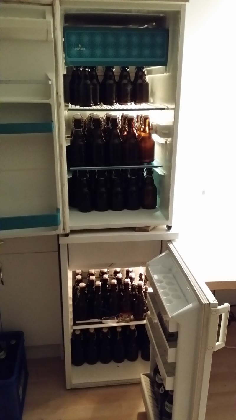 Im nächsten Bild dann Neuerung 8: Ein Brautisch, selbst gebastelt. Hier steht der Kessel zum Wirlpool auf zwei Fliesen auf dem Brautisch.