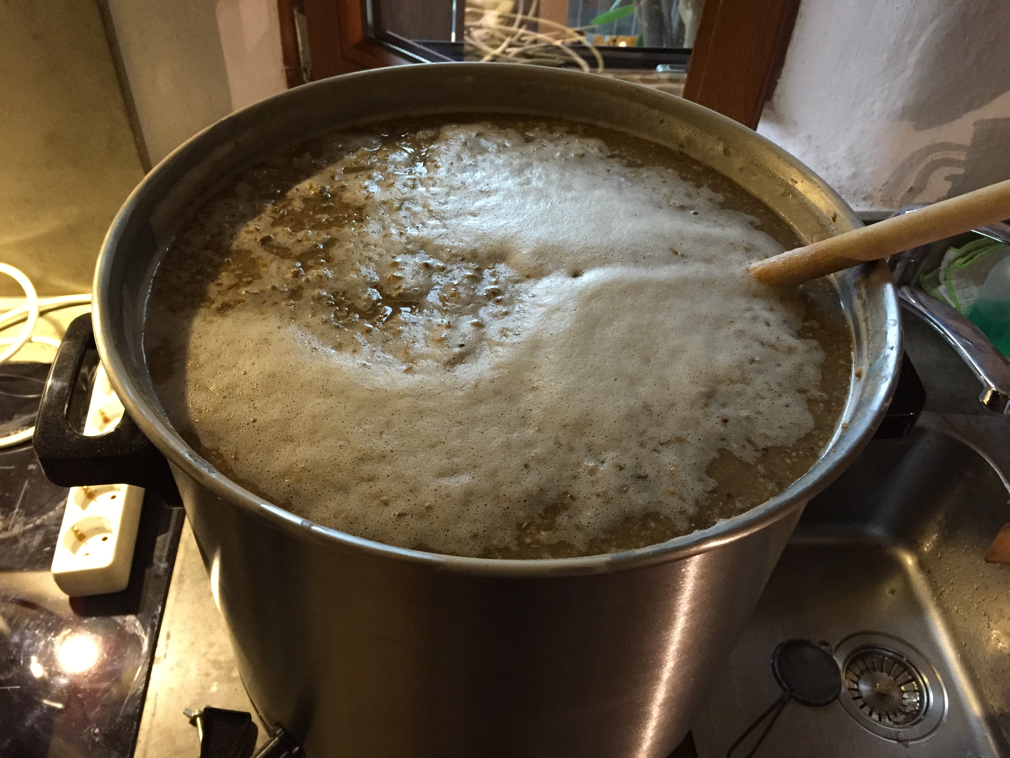 Dass ich mit den Nachgüssen beim Läutern vielleicht ein bisschen früh aufgehört habe, habe ich erst am Ende des Kochens gemerkt, als nur noch 19,5 Liter im Topf waren.