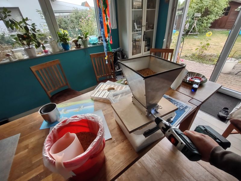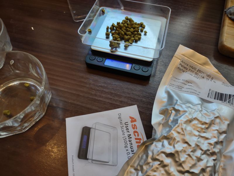 Das Braugeraffel steht bereit. 40L Wasser sind mit 6g Braugips und 10ml 9%iger Salzsäure vorbereitet. 5550g PiMa und 750g MüMa2 abgewogen und bereit, geschrotet zu werden. Beim Schroten, Sekunden vor Katastrophe 1 an diesem Tag. Die passive Walze verkeilte sich und beim Versuch, das Problem zu beheben, ergoss sich der Trichterinhalt über den kompletten Tisch. Wie gut, dass ich alleine zuhause war... Bereit zum Einmaischen zu einer 10 minütigen Eiweißrast bei 57 Grad. Nach dem Zubrühen auf Maltoserast. Nach 45 Minuten Maltoserast aufheizen der ersten Kochmaische mit Dickmaische zur Verzuckerungsrast bei 72 Grad. Nach 20 Minuten Rast, bei der zweiten Dekoktion mit Läutermaische dann die 2. Katastrophe: ich war kurz abgelenkt und der Kram ist des Todes übergekocht. Kompletter Terrassentisch und Induktionsplatte voll mit Würze. Zum Glück braue ich draußen und war allein zuhause... Und es war auch noch genügend Kochmaische im Topf, um die Abmaischtemperatur zu erreichen... Zeit für den Hopfen. Ich habe beim Rezept nochmal die Hopfengaben angepasst auf jeweils 11g Amira/HVG ZS01 mit 11,9% zur Vorderwürze, bei 30 und 10 Minuten. Läutern mit Vorderwürzehopfen. Nach 4 Litern Vorlauf relativ klar. Es kocht. Mir kommen jetzt schon die Tränen, wenn ich an den nächsten Gasflaschentausch denken muss... Später war noch ein Braukollege da, um seinen Teil der Amira Sammelbestellung abzuholen und hatte ein leckeres Chocolate Stout dabei. War auch eine große Hilfe dabei, den am Ende mit gut 30L gefüllten Fermzilla in den Gärkühlschrank zu verfrachten. Das Abkühlen auf Anstelltemperatur hat sich leider etwas hingezogen, aber ich konnte dann heute morgen um 5 Uhr die Würze bei 7 Grad belüften und habe dann 2 Säckchen W34/70 auf den Schaum aufgestreut, wie das in letzter Zeit öfter empfohlen wird. Inkbird ist jetzt auf 9 Grad zur Hauptgärung eingestellt und ich harre dem Ankommen entgegen. Bin schon gespannt, ob sich nach Feierabend schon was tut...