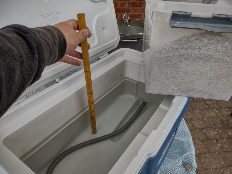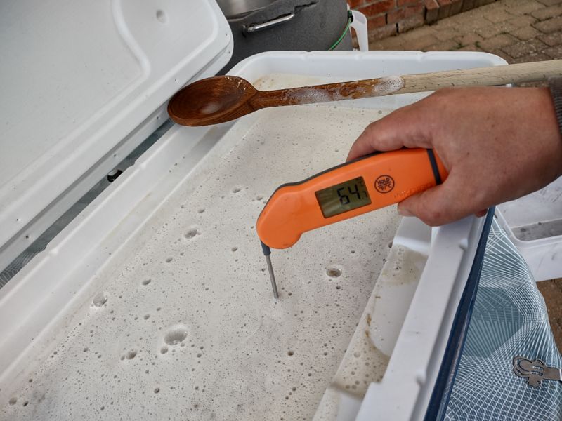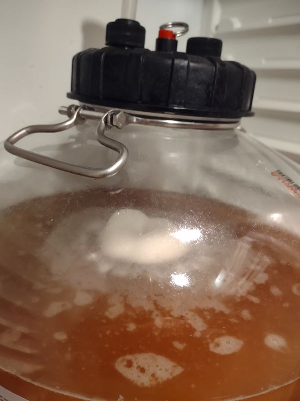 Der Sud durfte eine Woche bei 9°C gären, danach war er bis 8 Brix runtervergoren und ich habe das Spundventil draufgesetzt und die Temperatur bis 16°C steigen lassen. Dabei habe ich den gewünschten Sättigungsdruck um 0,5 bar verpasst. Am Wochenende dann den Inkbird zum Cold Crash auf 2°C eingestellt und gestern noch mit ein bisschen CO2 aus der Flasche den fehlenden Rest Kohlensäure ausgeglichen.