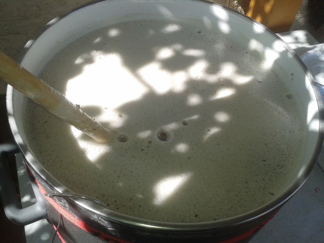 Und dabei gleich das Erste gelernt: Nächstes Mal die Maischepfanne etwas niedriger aufstellen, sodass auch die Gattin mit weniger als 1,90m Körpergröße bequem rühren kann… :Bigsmile