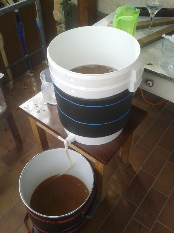 Als Kriterium für die Menge der Nachgüsse steht in dem keep it simple-Rezept einfach „bis der Einkocher fast voll ist“. Also mit den vielen Kochplatten und Töpfen etwas jongliert um jeweils die richtige Temperatur zu haben und insgesamt ca. 12.5l Nachgüsse aufgetragen.