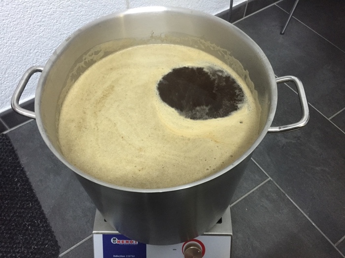 Hier wird der Hauptguss im 70L Polsinelli Edelstahltopf auf 12 kW Gasbrenner erhitzt.
