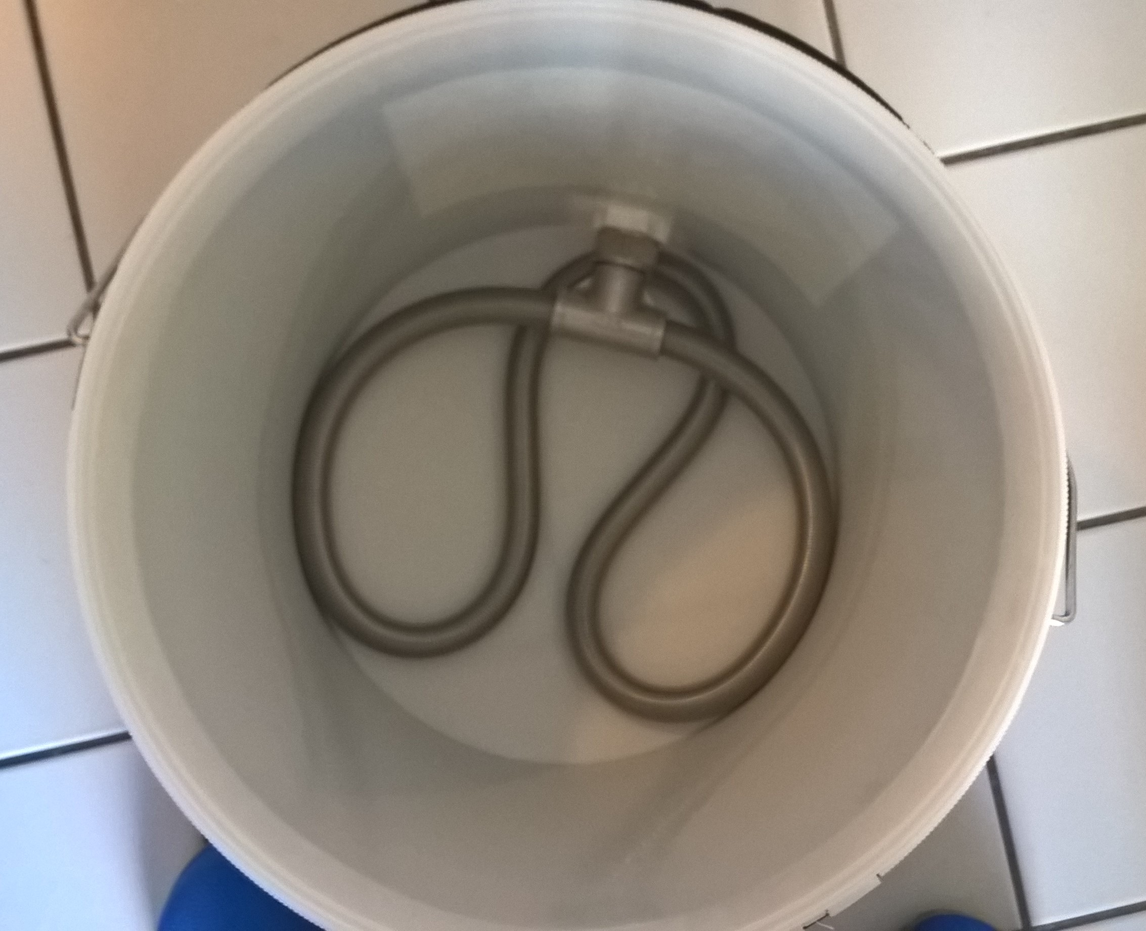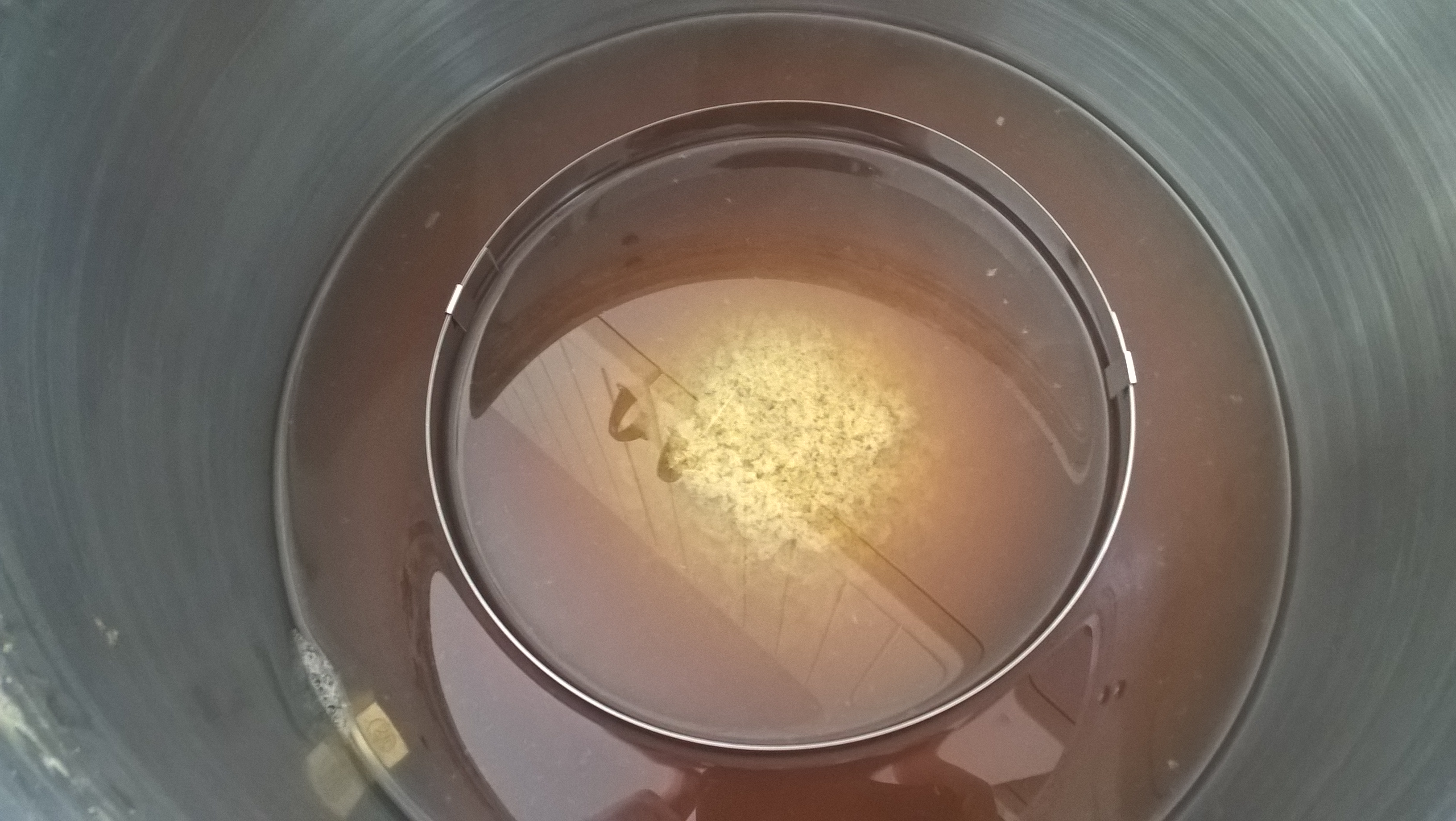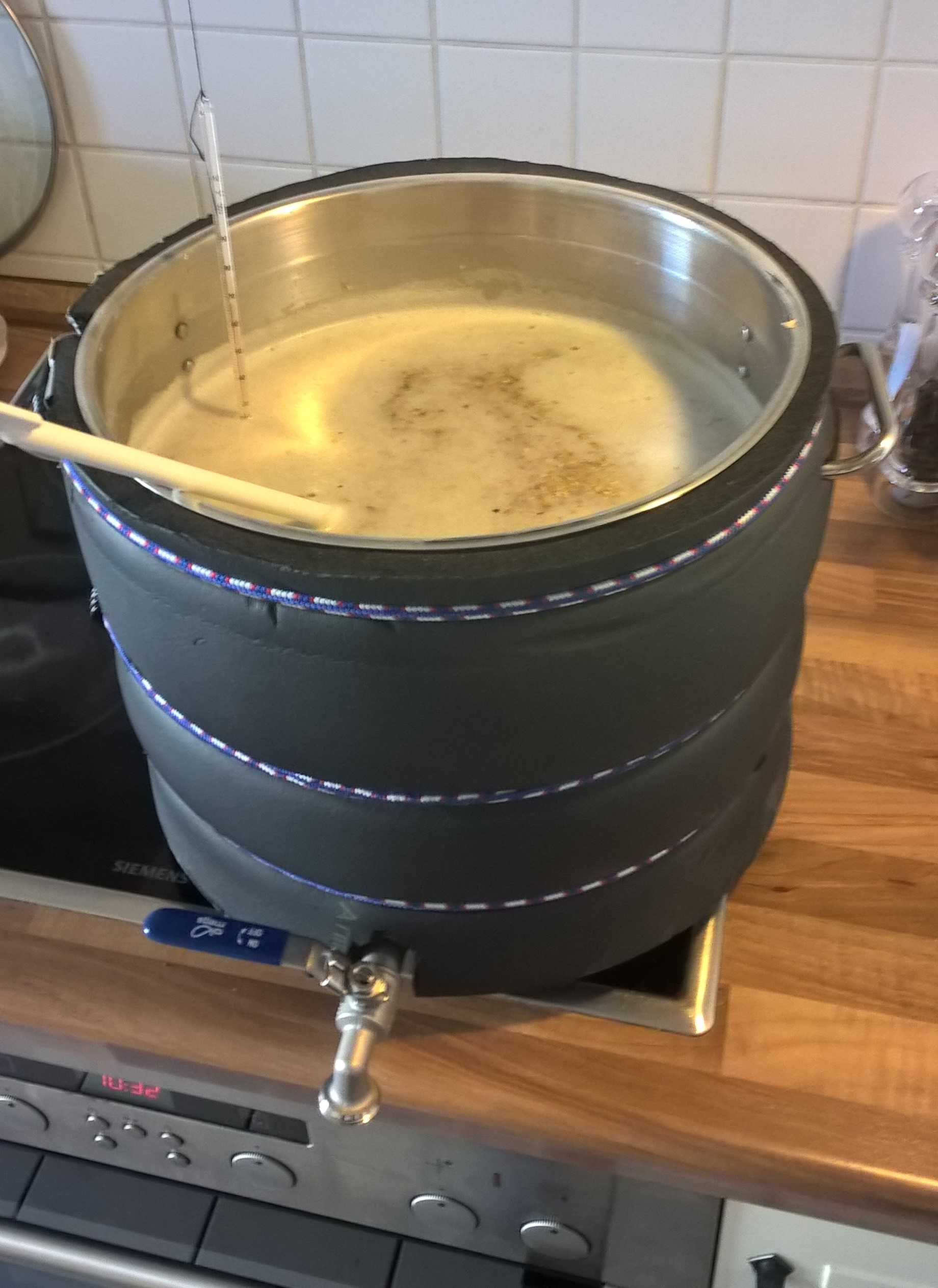 Begonnen wurde am Vorabend mit dem Abwiegen und Schroten des Malzes. Das Schrotbild sieht bei mir folgendermaßen aus, da die Corona eine Neuanschaffung ist, bin ich über Hinweise zum Schrotbild dankbar. Am nächsten Morgen wurden die restlichen Rohfruchtanteile abgewogen und vorbereitet. Hier ein Bild der von mir verwendeten Polenta, da das Thema letztens wieder diskutiert wurde. Nun alles einmaischen im großen Kochtopf (mit Armaflex isoliert, funktioniert super) Während der 90 minütigen Kombirast und dem andauernden Rühren, (Nächstes Ausbauschritt ist ein Rührwerk) würde schonmal der Läuterbottich mit der Läuterhexe ausgestattet. Am Ende der Rast, der große Moment, Jodnormal oder nicht? Ich war tatsächlich etwas angespannt nach all den Berichten von Blausuden. Aber, PUHHH, alle ok! Also alles in den Läuterbottich, Läuterruhe von 15 Minuten, 2 Liter Vorlauf bis alles schon klar war und los gings. Leider ereilte auch mich das Schicksal mit Läuterproblemen, schade ich dachte schon ich komme ungeschoren davon. Nach rund 3-4 Litern lief es nur noch tröpfchenweise. Aber einschneiden des Trebers brachte dann den gewünschten Erfolg und so konnte ich am Ende 17Liter mit 11°Plato zum Kochen bringen. Wallendes Kochen ist mit Armaflex Isolierung und Herdplatte natürlich kein Problem. (Hier habe ich leider das Foto machen vergessen). Zu guter letzt noch den Whirlpool andrehen und durch den Hahn und Monofilamentfilter ins Gärfass ablassen. Dank Tortenring klappt das wunderbar. Somit landen 14.5 Liter mit 13°Plato im Gärfass und ein erfolgreicher Brautag geht zu Ende. Frühestens in 3 Wochen wird in Flaschen abgefüllt(Komme Arbeitstechnisch nicht früher dazu) und das Bier gesellt sich nach abgeschlossener Nachgärung zu seinen Freunden in den Bierkühlschrank, mit Edelstahlblecheinlage, sodass das Gemüsefach als zweite Lagerfläche genutzt werden kann. (Wer brauch schon Gemüse?