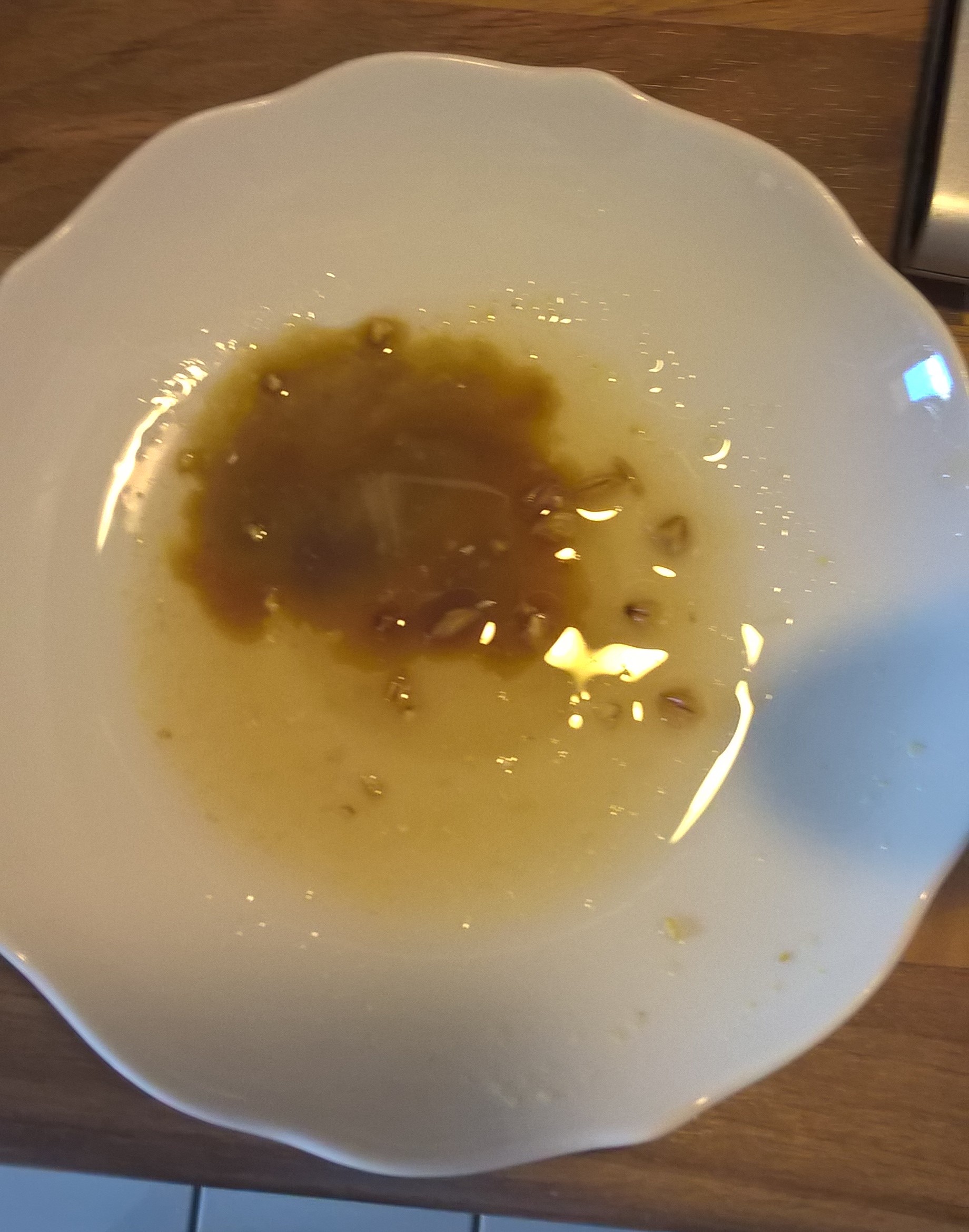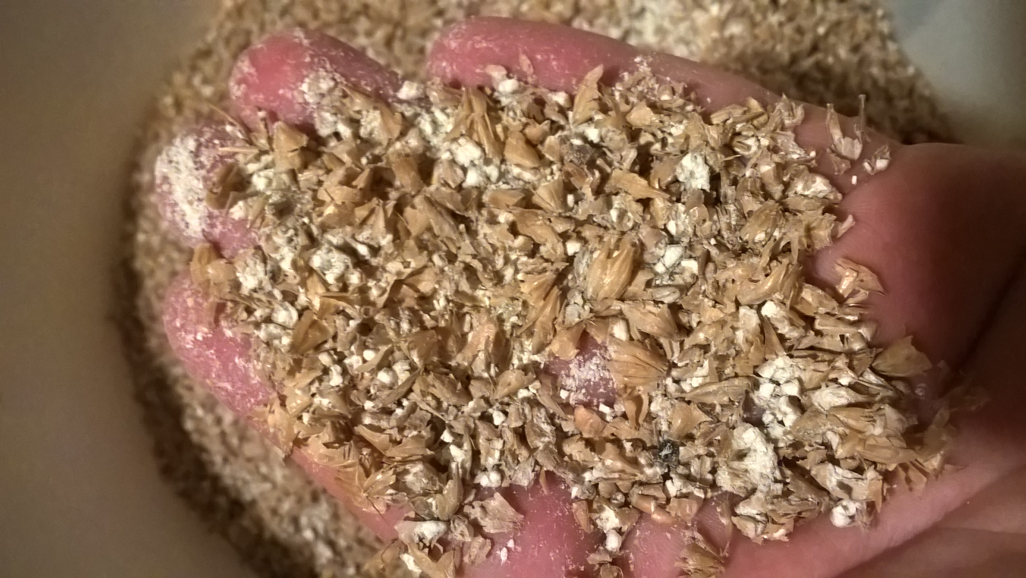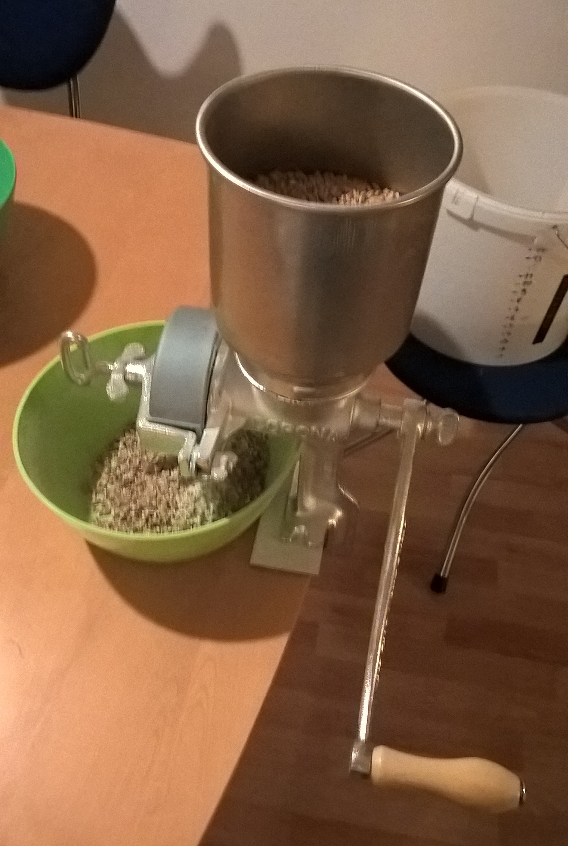 Begonnen wurde am Vorabend mit dem Abwiegen und Schroten des Malzes. Das Schrotbild sieht bei mir folgendermaßen aus, da die Corona eine Neuanschaffung ist, bin ich über Hinweise zum Schrotbild dankbar. Am nächsten Morgen wurden die restlichen Rohfruchtanteile abgewogen und vorbereitet. Hier ein Bild der von mir verwendeten Polenta, da das Thema letztens wieder diskutiert wurde. Nun alles einmaischen im großen Kochtopf (mit Armaflex isoliert, funktioniert super) Während der 90 minütigen Kombirast und dem andauernden Rühren, (Nächstes Ausbauschritt ist ein Rührwerk) würde schonmal der Läuterbottich mit der Läuterhexe ausgestattet. Am Ende der Rast, der große Moment, Jodnormal oder nicht? Ich war tatsächlich etwas angespannt nach all den Berichten von Blausuden. Aber, PUHHH, alle ok! Also alles in den Läuterbottich, Läuterruhe von 15 Minuten, 2 Liter Vorlauf bis alles schon klar war und los gings. Leider ereilte auch mich das Schicksal mit Läuterproblemen, schade ich dachte schon ich komme ungeschoren davon. Nach rund 3-4 Litern lief es nur noch tröpfchenweise. Aber einschneiden des Trebers brachte dann den gewünschten Erfolg und so konnte ich am Ende 17Liter mit 11°Plato zum Kochen bringen. Wallendes Kochen ist mit Armaflex Isolierung und Herdplatte natürlich kein Problem. (Hier habe ich leider das Foto machen vergessen). Zu guter letzt noch den Whirlpool andrehen und durch den Hahn und Monofilamentfilter ins Gärfass ablassen. Dank Tortenring klappt das wunderbar. Somit landen 14.5 Liter mit 13°Plato im Gärfass und ein erfolgreicher Brautag geht zu Ende. Frühestens in 3 Wochen wird in Flaschen abgefüllt(Komme Arbeitstechnisch nicht früher dazu) und das Bier gesellt sich nach abgeschlossener Nachgärung zu seinen Freunden in den Bierkühlschrank, mit Edelstahlblecheinlage, sodass das Gemüsefach als zweite Lagerfläche genutzt werden kann. (Wer brauch schon Gemüse?