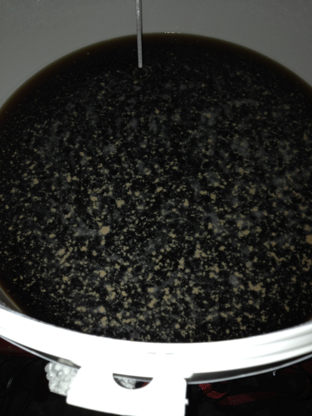 Dann habe ich die Würze in den Keller verfrachtet, weiter abkühlen lassen (mit ein paar Ice-Packs nachgeholfen) und schließlich heute Nachmittag angestellt. Nach dem Einrühren der Hefe und etwas Belüften zeigte der Fühler außen am Behälter 20,2° C.