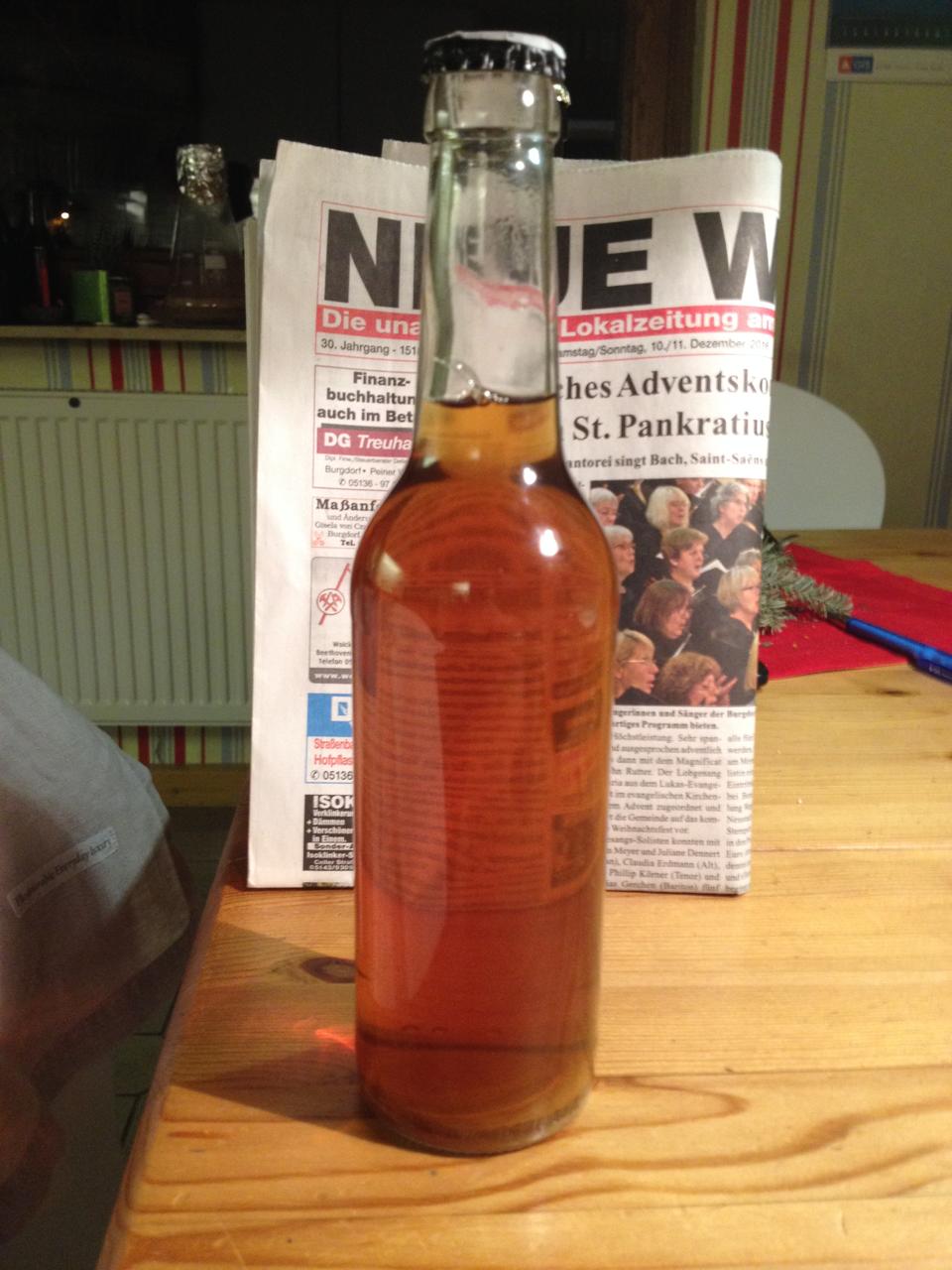Es gibt noch ein paar Flaschen von dem Zeug. Heute beim Umräumen habe ich eine (klare) Flasche aus dem Reifekühlschrank geholt und fotografiert.