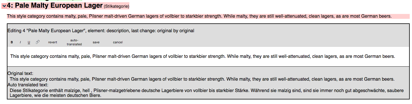 Das System besorgt sich die Style-Guides im XML-Format von den BJCP-Servern u. setzt einen Web-basierten Editor oben drauf. Alle im Editor gemachten Änderungen werden in ein Git-Hub-Projekt synchronisiert. Auf diese Weise kann jeder sehr einfach mithelfen die Style-Guides zu übersetzen !!