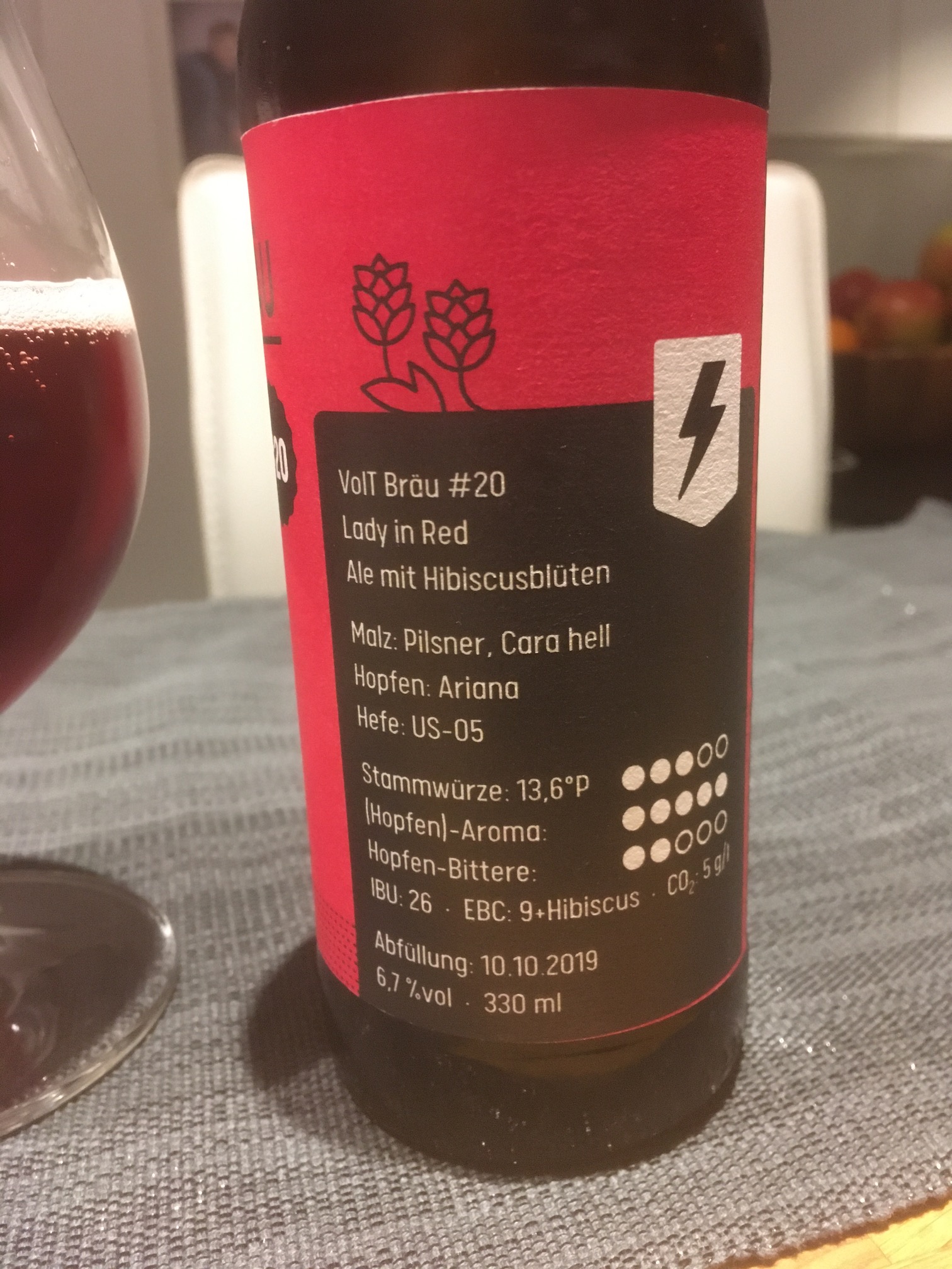 Unter dem Namen "Lady in Red" Kommt ein "Ale mit Hibiscusblüten" daher. Schon beim Einschenken zeigt das Bier eine Lila Farbe, der Schaum ist Rosa - das ist schonmal ungewöhnlich! Als Hopfen kommt hier Ariana zum Einsatz. Mir ist es nicht gelungen die Aromen vom Hopfen und die der Hibiskusblüten zu differenzieren, aber das Aroma gefällt, offensichtlich gut ausgewählt die Kombi. Restsüße fällt eher gering aus, dafür ist eine leichte Säure wahrnehmbar. Ein wirklich schönes Bier, sowas habe ich bisher noch nicht getrunken!