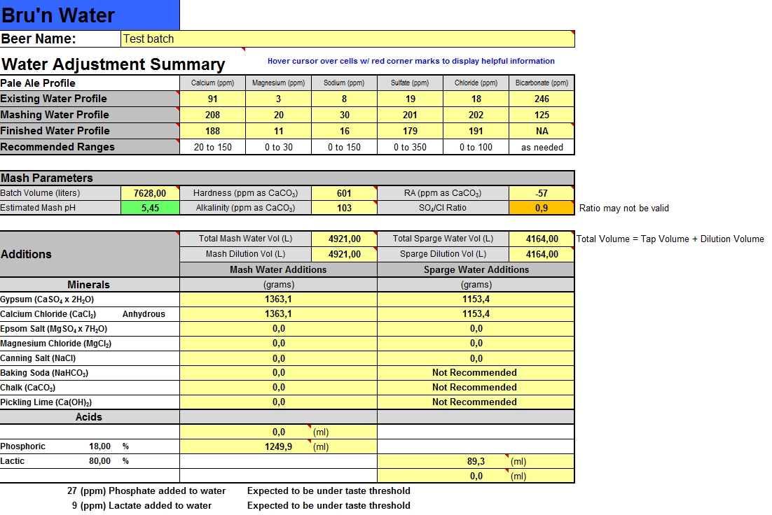 Die Salzmenge passt recht passabel zum Rezept von "Firestone-Pliny" (0,27g/L), bei der Säure ist ein Faktor 2 bei der Menge erkennbar, allerdings ist unklar welche Säure benutzt wird. Das ergibt zwar recht hohe negative Restalkalitäten und geringe pH-Werte für die Maische aber genau diese sind bei IIPA-Brauern sehr beliebt (Interview mit John Kimmich von the Alchemist). Außerdem sind die Top-Brauer in der Szene von den absurd hohen Sulfatwerten abgekommen und legen mehr Wert auf hohe Chloridgaben.