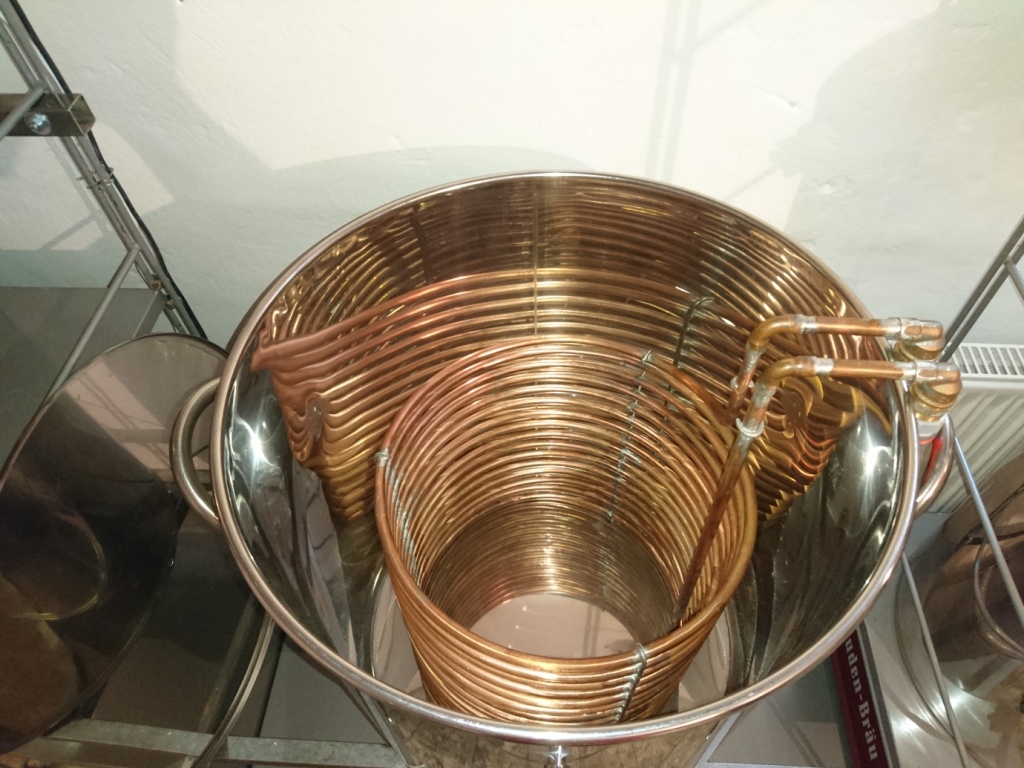 wenn Eintauchkühler, dann bietet sich Edelstahlwellrohr an. Die größere Oberfläche gleicht die schlechtere Wärmeleitfähigkeit wieder aus. Willkürlich bei eBay rausgesucht: https://www.ebay.de/itm/Edelstahl-Wellr ... SwOgdYpNkz