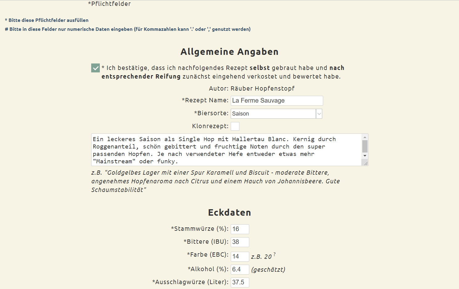 Auch nochmal alle Pflichtfelder prüfen (Sternchen). Da fehlt ja noch die ganze Zutatenliste sowie Maische und Gärung.