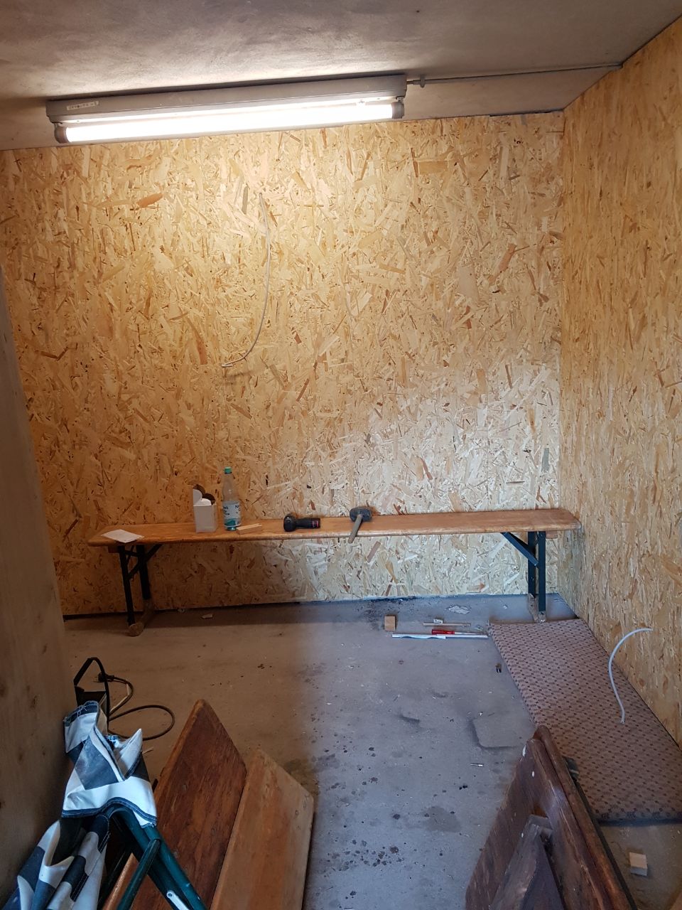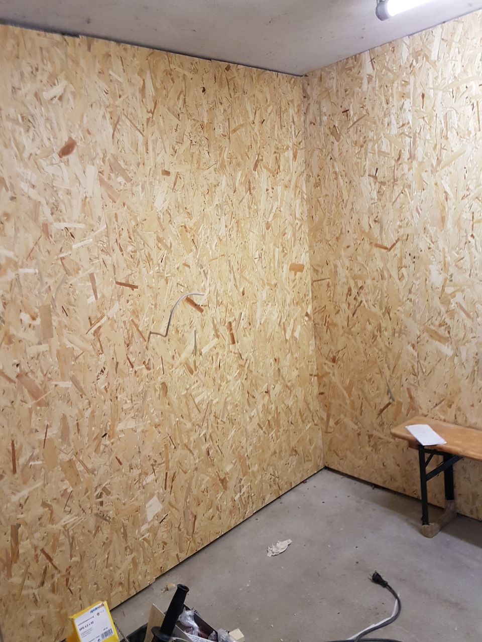 Der Raum wird komplett mit OSB Platten verkleidet und isoliert 6quadratmeter werden mit einer Wand abgegrenzt.