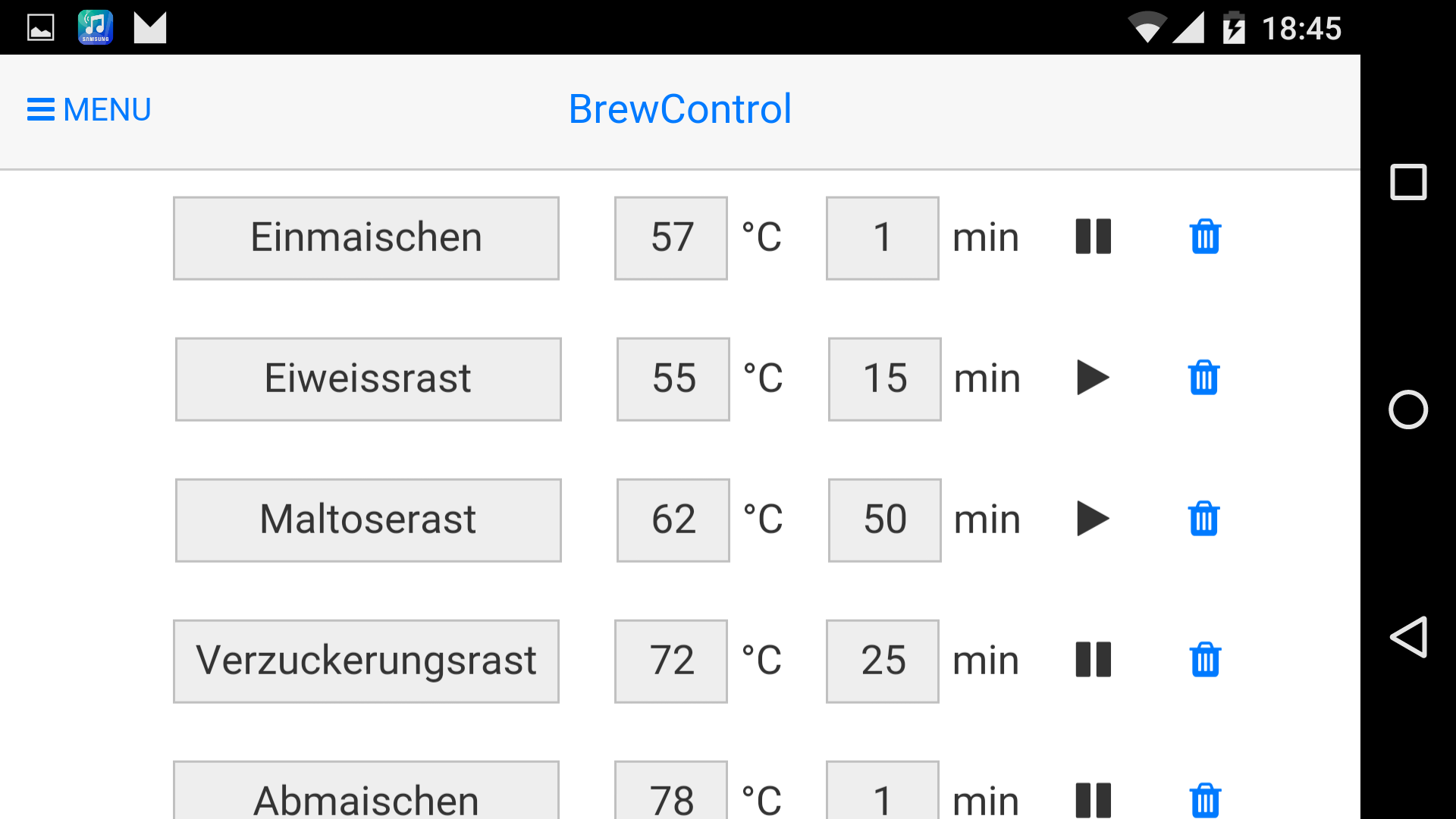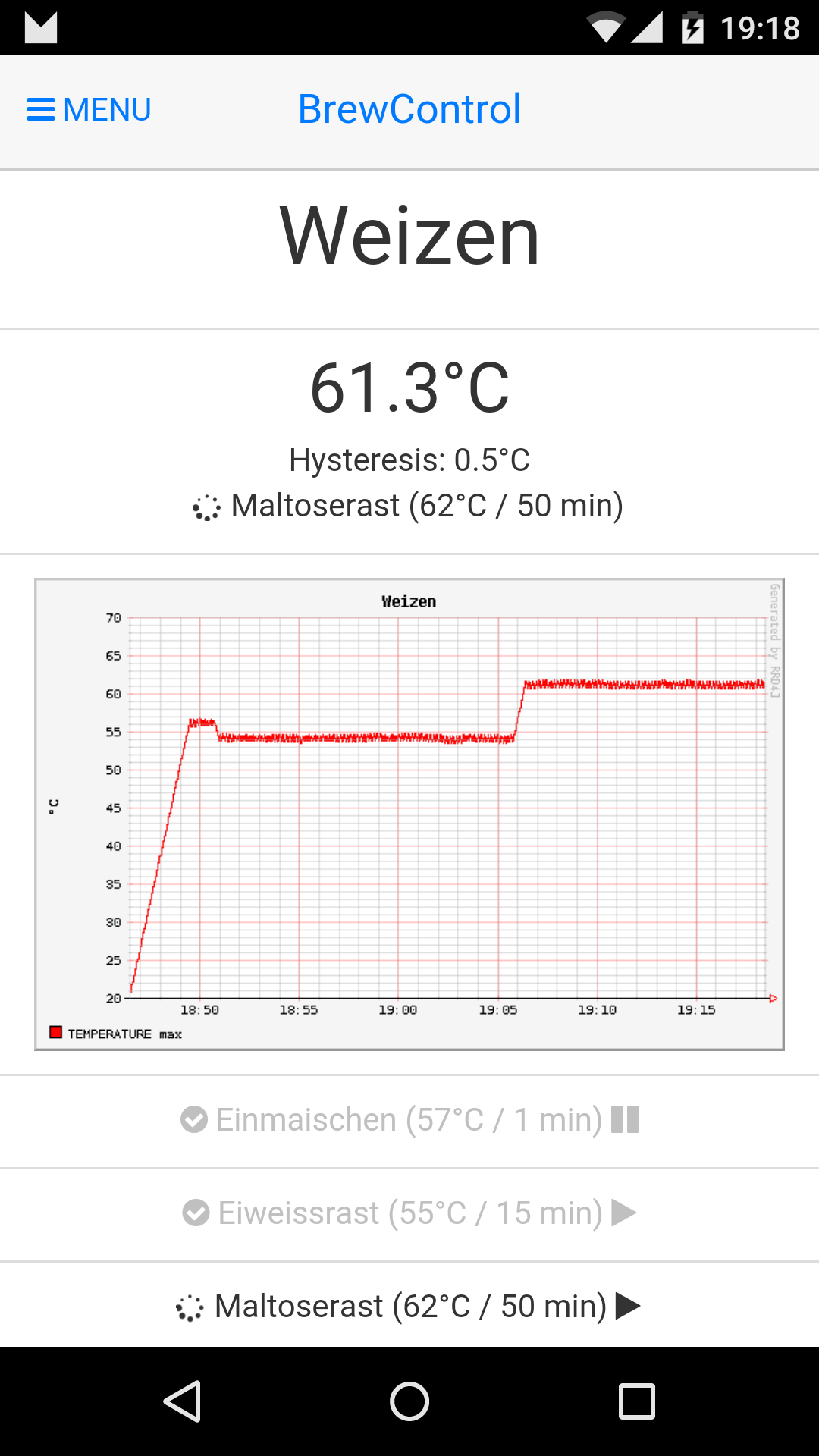 - Über einen physischen Taster kann der Maisch-Vorgang und manuelle Rasten (Einmaischen, Verzuckerungsrast) gestartet werden