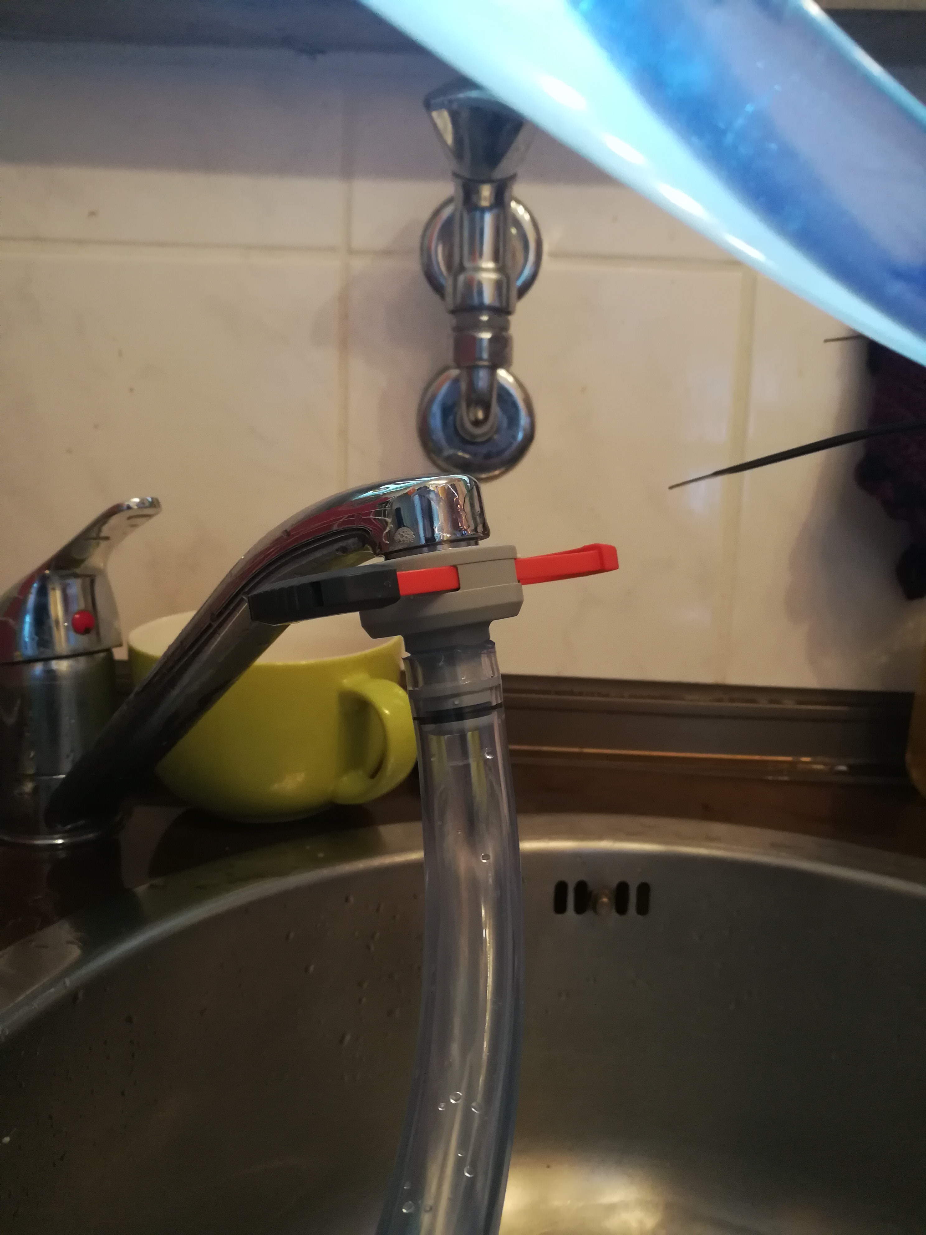 Den Gardena Adapter einbauen und einen der PVC-Schläuche daran anschließen. Die 16 mm PVC-Schläuche passen glücklicherweise so genau auf den Gardena Adapter, dass man die Verbindung hier nicht mit einem Kabelbinder dicht machen muss, kann man aber trotzdem tun. Das ganze Ergebnis sieht dann so aus Nicht besonders schön, aber funktioniert!