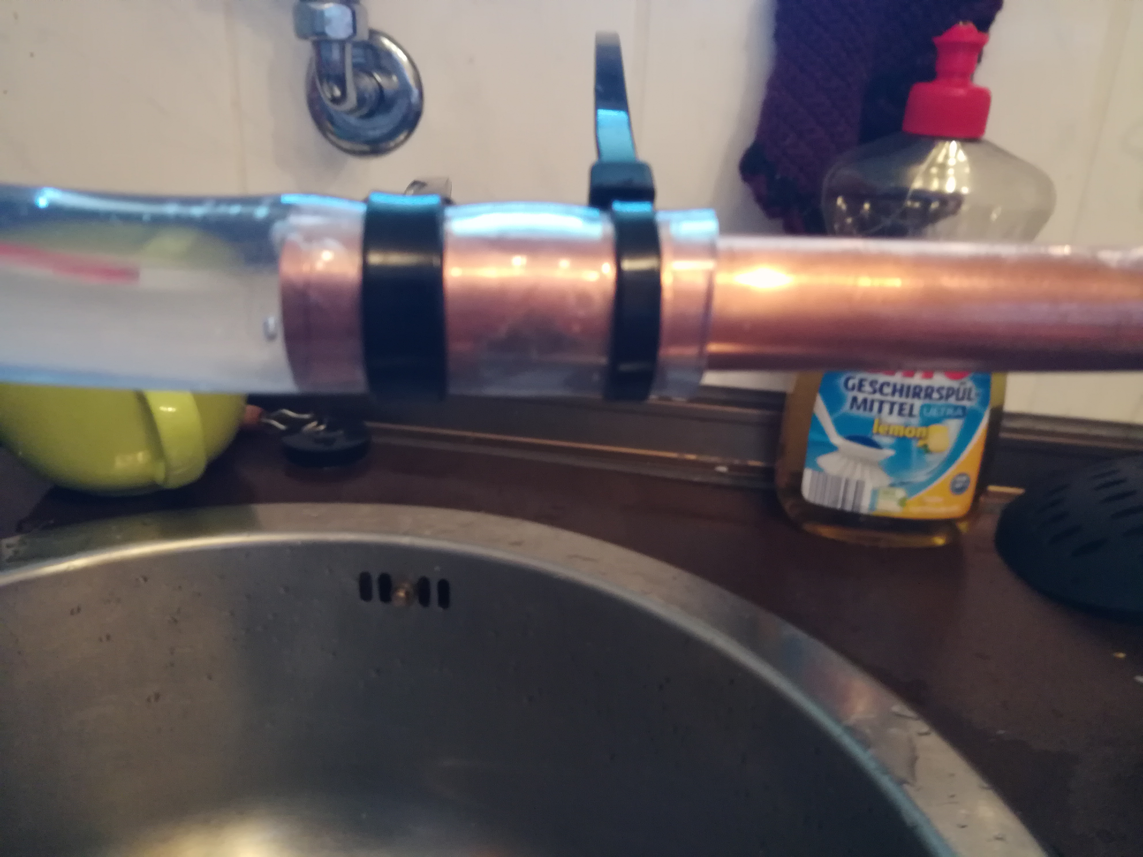 Den PVC Schlauch etwa in der Mitte durschschneiden und über die Enden der Kupferspirale stecken. Dann mit jeweils 2 Kabelbindern fest machen.