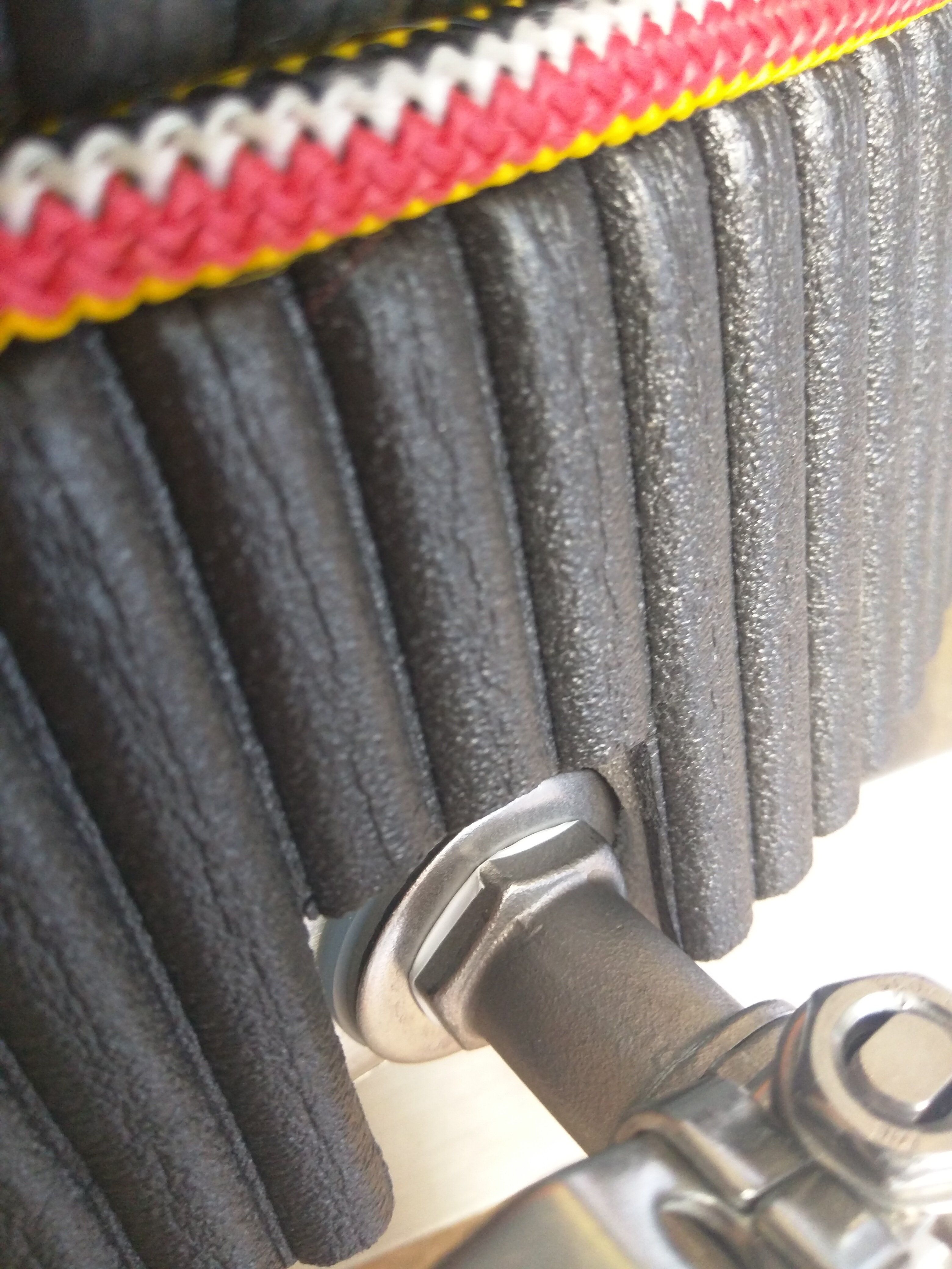Dafür lege ich, bevor ich die Unterlegscheibe aufstecke, ein bis zwei Windungen Teflonband so um das Gewinde, dass auch ein Teil der Sechskantschraube bedeckt ist. Zwischen Scheibe und Topf kommt dann die Dichtung. Innen nur noch die Mutter ohne Unterlegscheibe oder Dichtung.