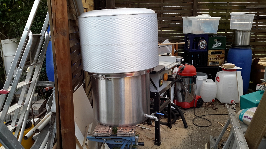 Der Hack mit der Trocknertrommel begeistert mich. Ich habe mal eine zufällig herumliegende Trommel auf einen 67 l Amihopfentopf gestülpt.