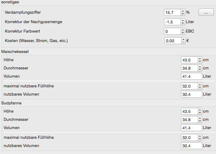 Anbei zur Hilfe & gerne Korrekturhinweise unsere 'Ausrüstungs'-Werte im kl. Brauhelfer (Version 1.4.2.2 - update steht an).