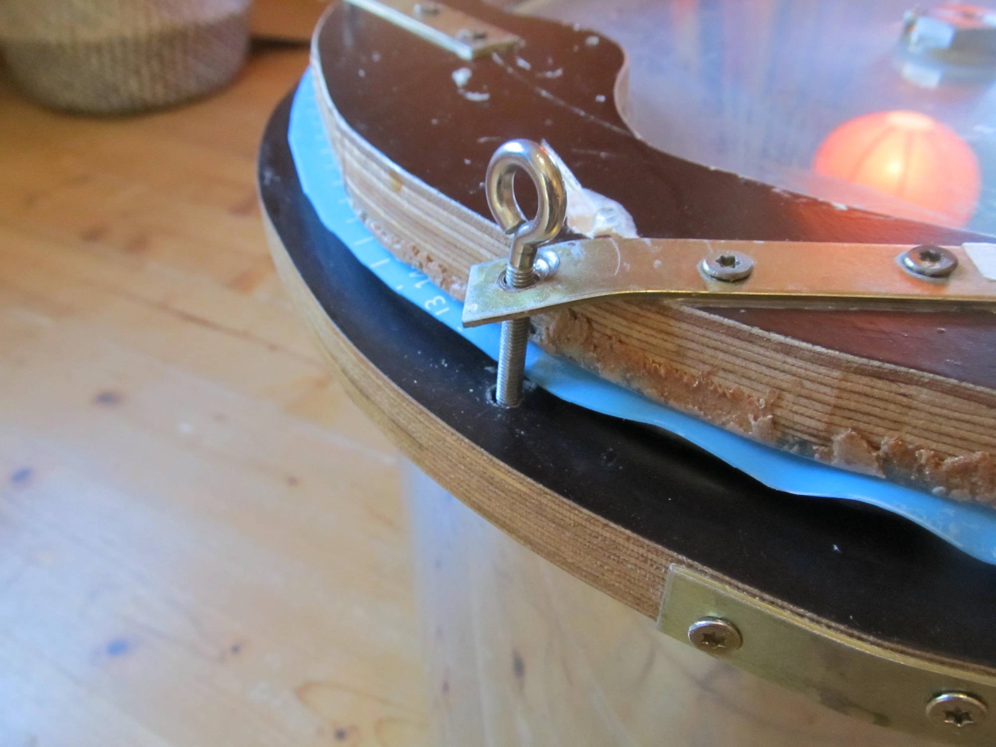 Ring aus Siebdruckplatte mit Spannschloß, der genau unter die Wulst des 50l-Schenglertopfes passt. Von unten sind 6 Einschlagmuttern versenkt So sieht das dann am Topf aus Die Unterseite des Deckels ist vollflächig Plexiglas mit aufgeklebter Silikonbackmatte als Dichtung. Der Prängel ist eine Tauchhülse zur Versenkung des Inkbirdfühlers. Die Spitze sitzt ziemlich genau in der Mitte meiner ca. 30-35l im Topf. Das zusätzliche Loch ist für den Gärspund. Von oben ist zur Verstärkung nochmal eine Siebdruckplatte aufgeklebt. Ich hatte den Deckel ursprünglich für einen kleineren Topf gebastelt, daher musste ich mit diesen Flacheisen den Deckel quasi vergrößern bzw. die Schraublöcher nach außen verlegen. Optimal wäre natürlich der Deckel vom Durchmesser identisch mit dem unteren Ring. Baue ich vielleicht nochmal neu irgendwann.