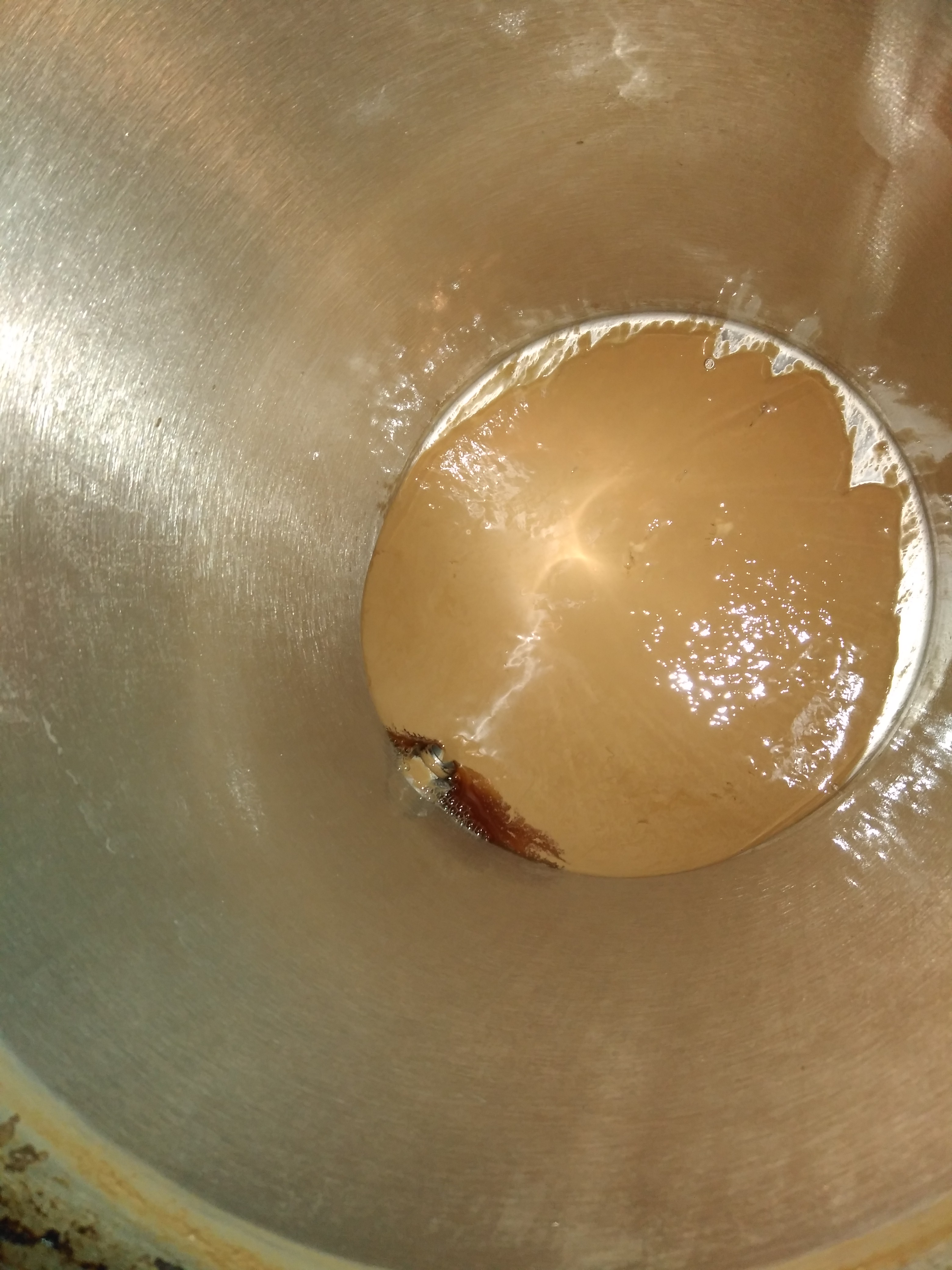 1. Nach der Vergärung, schon 5L abgefüllt. Den dunkelbraunschwärzlichen Kräusen-Schmodder kenne ich auch von meinem alten PE-Mostfermenter.