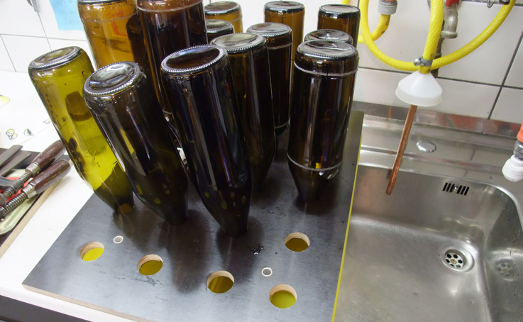 4. Flaschen in heißem Wasser mit "Sauerstoffreiniger" (z. B. Chemipro Oxi) etwa 10 Minuten einweichen, auf Flaschenbaum abtropfen lassen. Getrocknete Flaschen können dann direkt gefüllt werden.