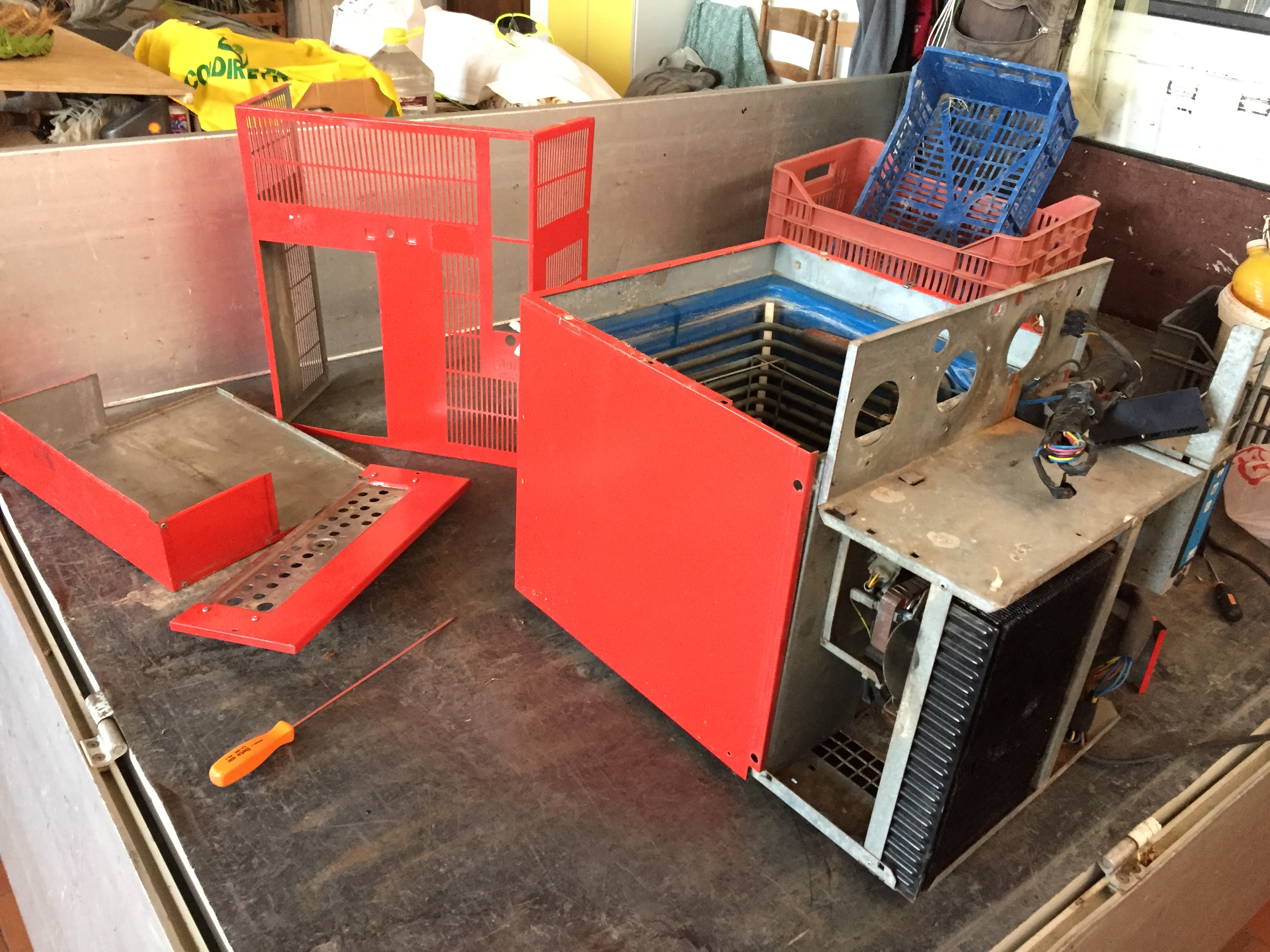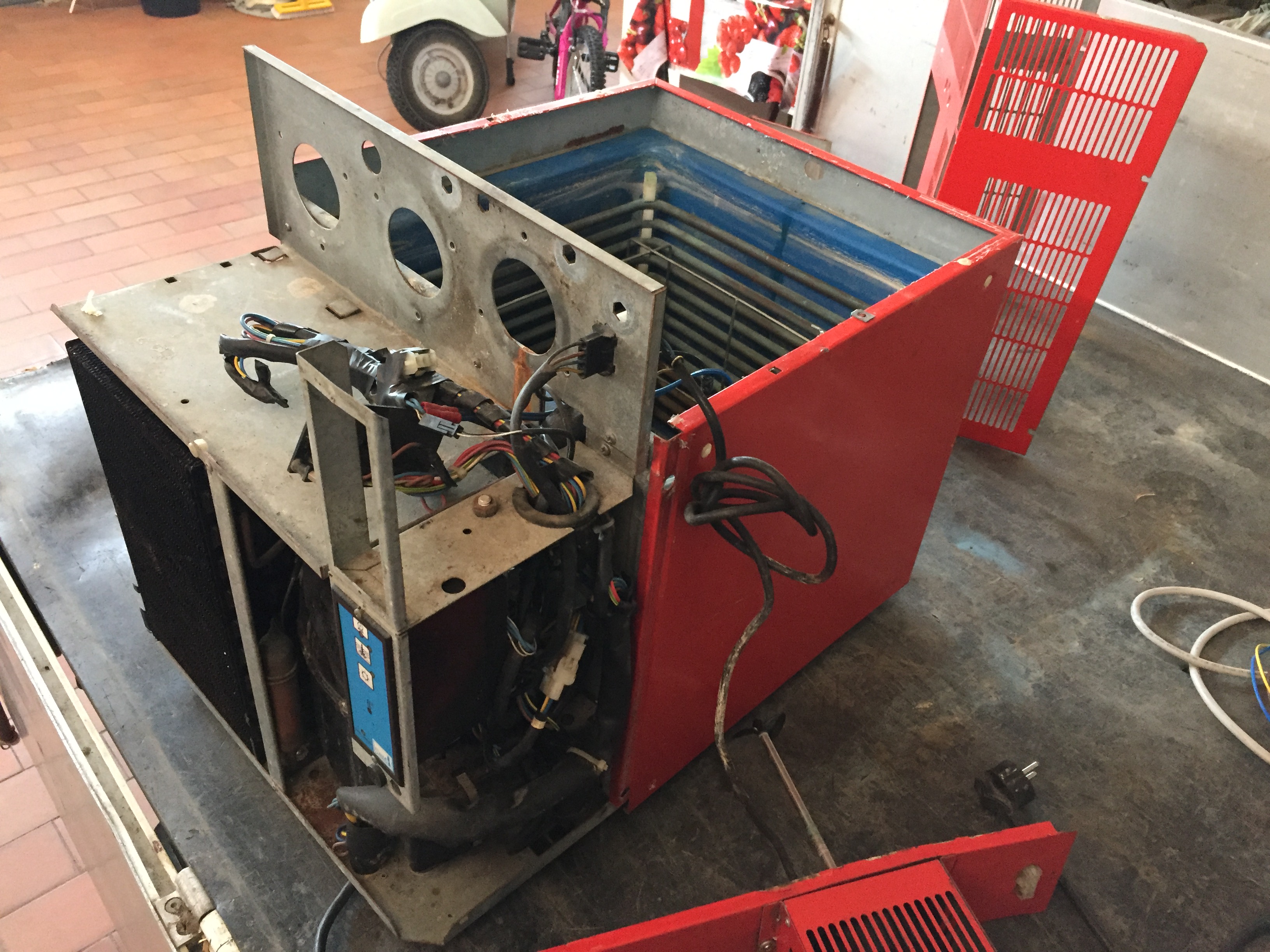 Als Startpunkt habe ich einen alten CocaCola Mischer/Karbonisierer mit Eisbank benutzt. Der Vorbesitzer hatte schon die Kuehlschlangen, die Pumpe, den Mixer und den Karbonisator ausgebaut.