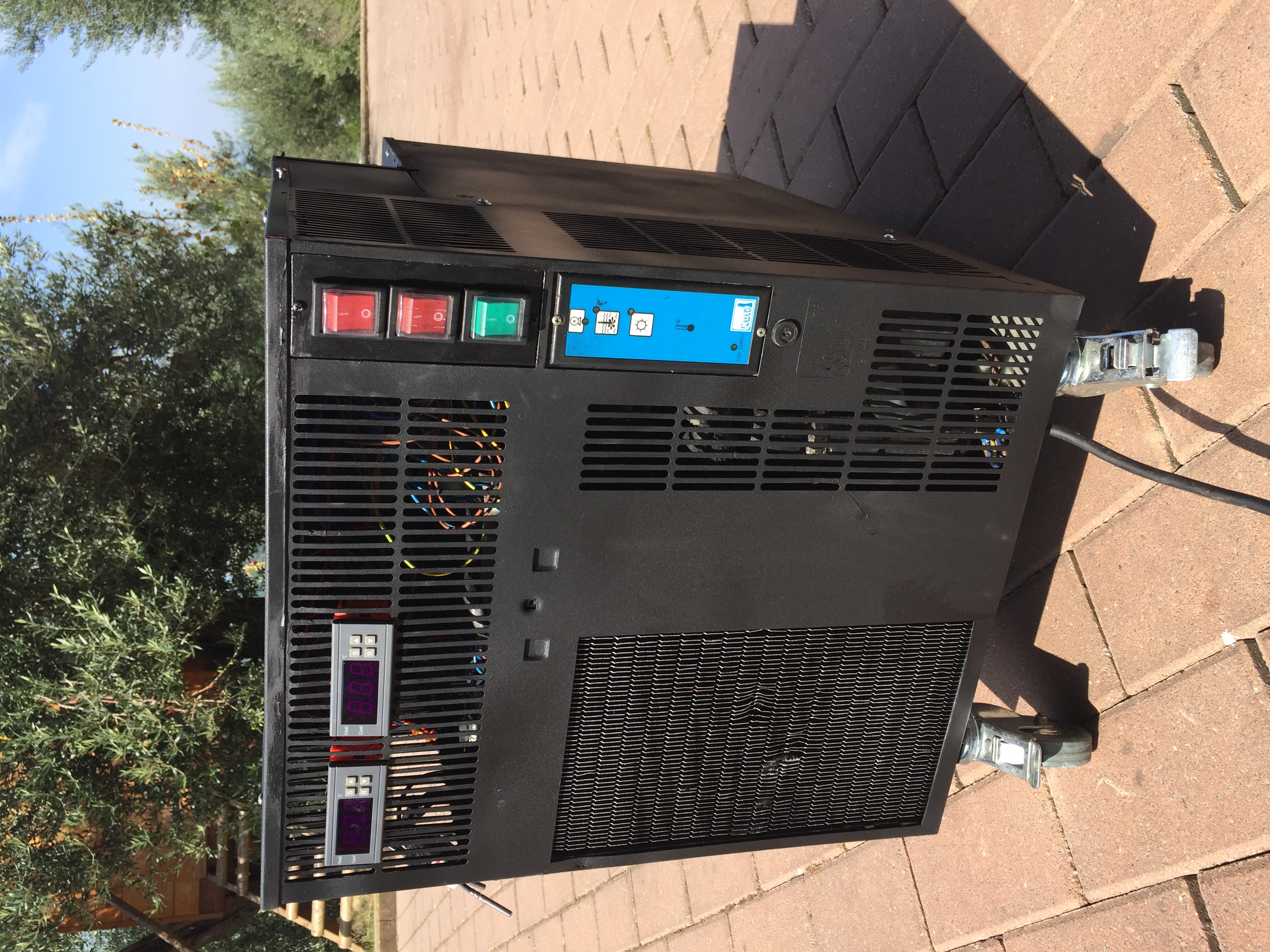 Alles wieder zusammen gebaut und zwei MH1210N Thermostaten eingebaut. Fuer die Kuehlung tauchen zwei Pumpen im Eisbank, fuer die Heizung haengen zwei Steckdose an der Seite. Eisbank, Thermostat 1, Thermostat2 sind 3 Stromkreise und koennen einzeln ein- und ausgeschaltet werden.