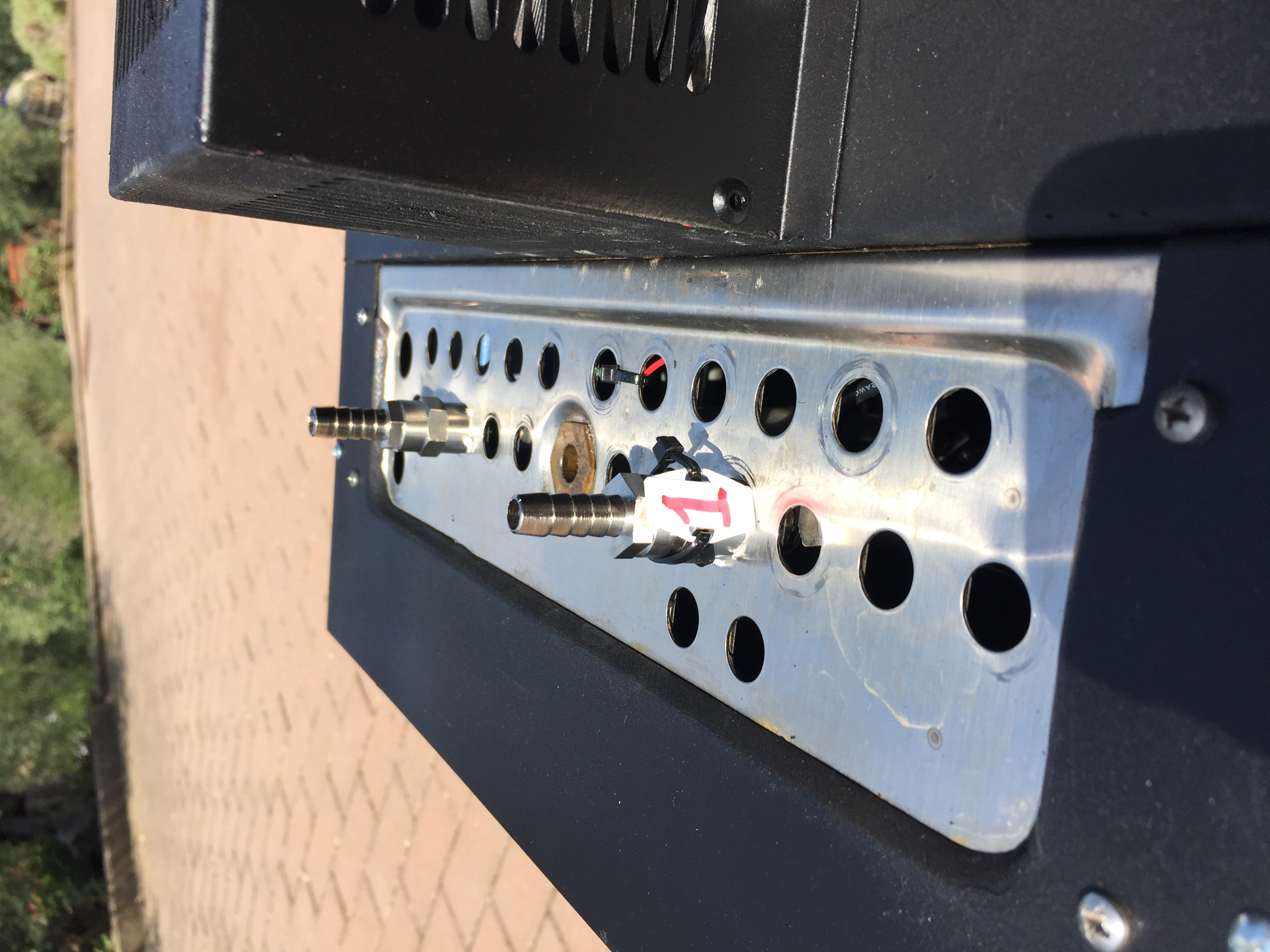 wie du in den Bilder sehen kannst, zwei Steckdosen haengen an der rechten Seite des Chillers. Die Steckdosen (1 pro Tank) sind vom Thermostat gesteuert und ich kann darin die Heizelemente einstecken, in meinem Fall werden sie Heizmatten oder -schlangen unten dem Tankisolierung sein, aber erst im Winter.