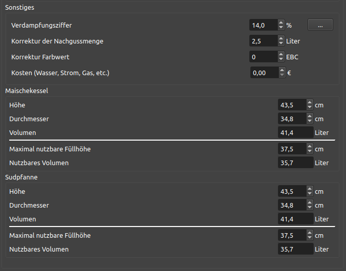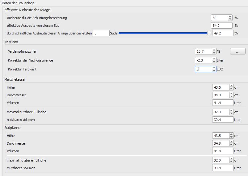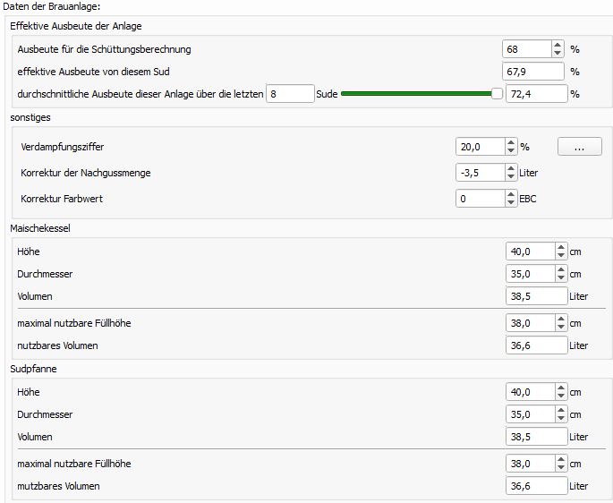 Anbei zur Hilfe & gerne Korrekturhinweise unsere 'Ausrüstungs'-Werte im kl. Brauhelfer (Version 1.4.2.2 - update steht an).